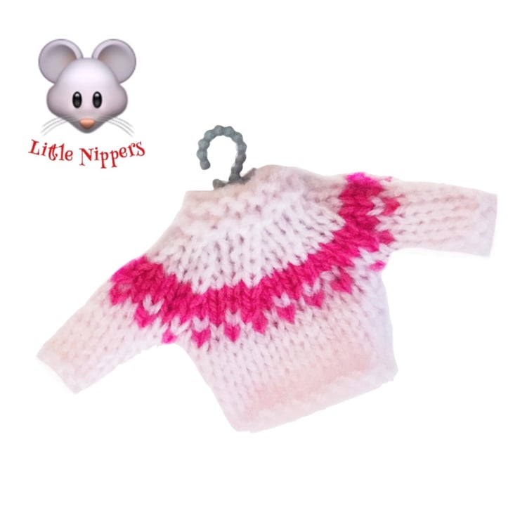 A cute little pale pink jumper, made especially to fit the Little Nippers, with a Fairisle pattern around the yoke. The jumper is hand-knitted in lovely soft wool and comes on a cute little hanger.