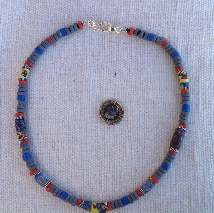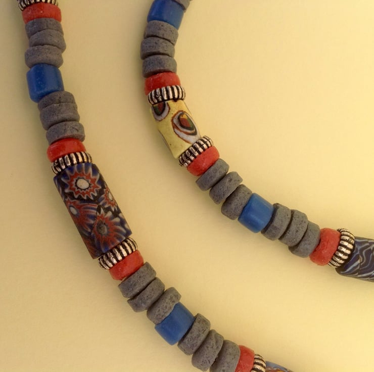 Beads: These beads are collectors items and are increasingly difficult to find, especially in such excellent condition. They have been threaded along with some vintage blue African glass beads and some modern beads from the Krobo region of Ghana. These beads are made in small village compounds, not in factories. The glass is recycled from old bottles.