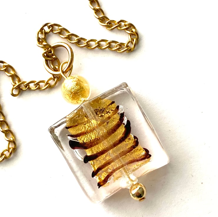 A gold and brown Murano glass pendant with a Murano glass 24k gold foiled gold and brown spangle bead (40mm) with a 24k gold foiled Murano glass round bead. The pendant hangs from a gold plated chain (18ins) and is presented in a pretty gift pouch.