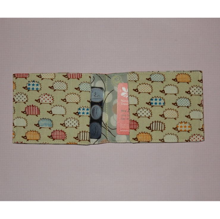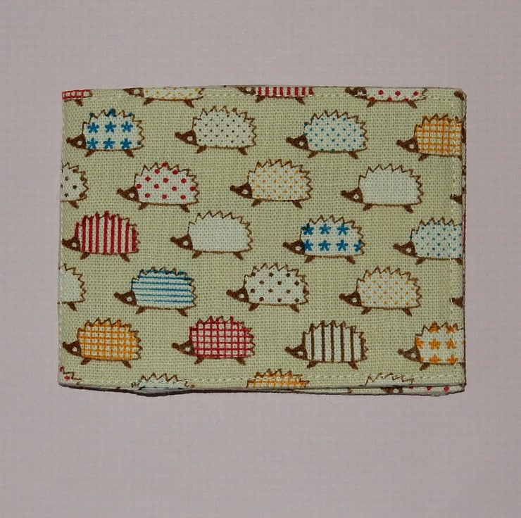 These hedgehogs are so cute on this hand made wallet, ideal for travel cards, Oyster cards, train tickets, bus pass or even credit cards. It measures approx. 3.5 x 3 inches folded and 7.5 inches open. It is made from a lovely lined effect fabric with a toning lining.