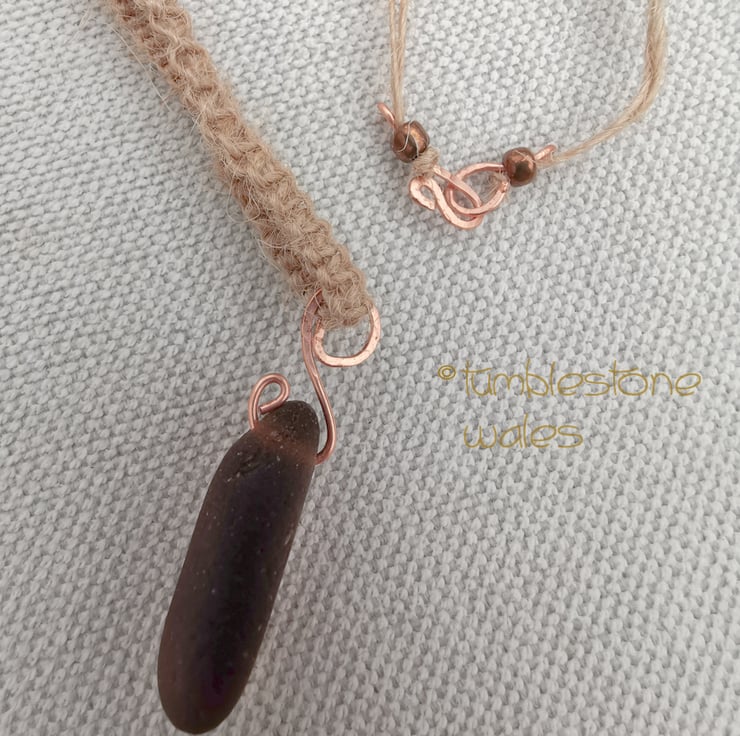 A beautifully sea-tumbled piece of smooth, rich brown genuine Welsh sea glass, with a handmade non tarnish copper bail and fastening. Necklace is made from natural colour macramed organic hemp. Unique piece.