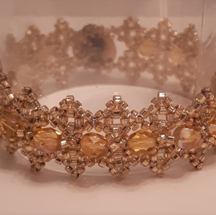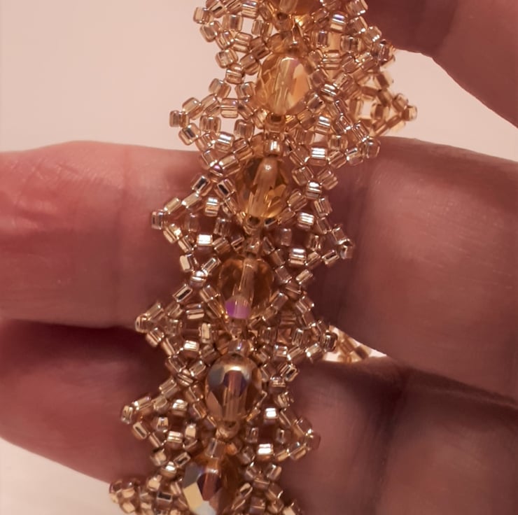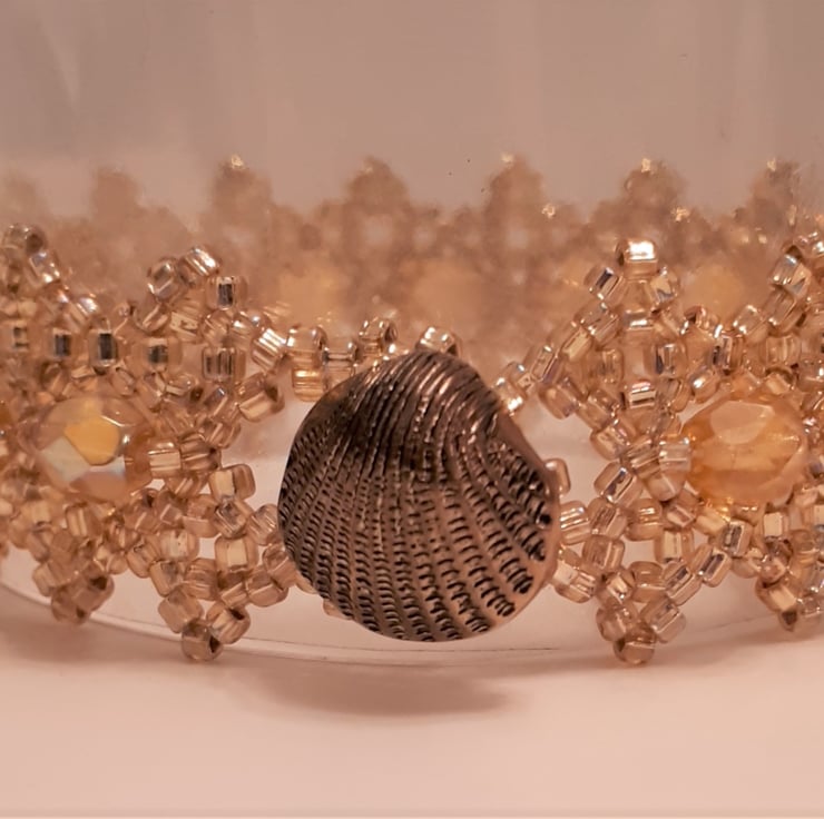 This pretty bracelet is made with golden seed beads, and golden fire-polished crystals down the centre, which add a delicate sparkle. It fastens with a shell shaped button and beaded loop Sized to fit a 7.25”/18.4cm wrist and is approx. .75”/2 cm wide