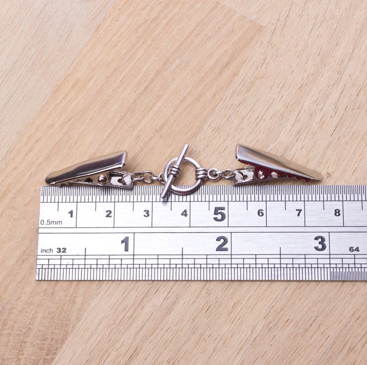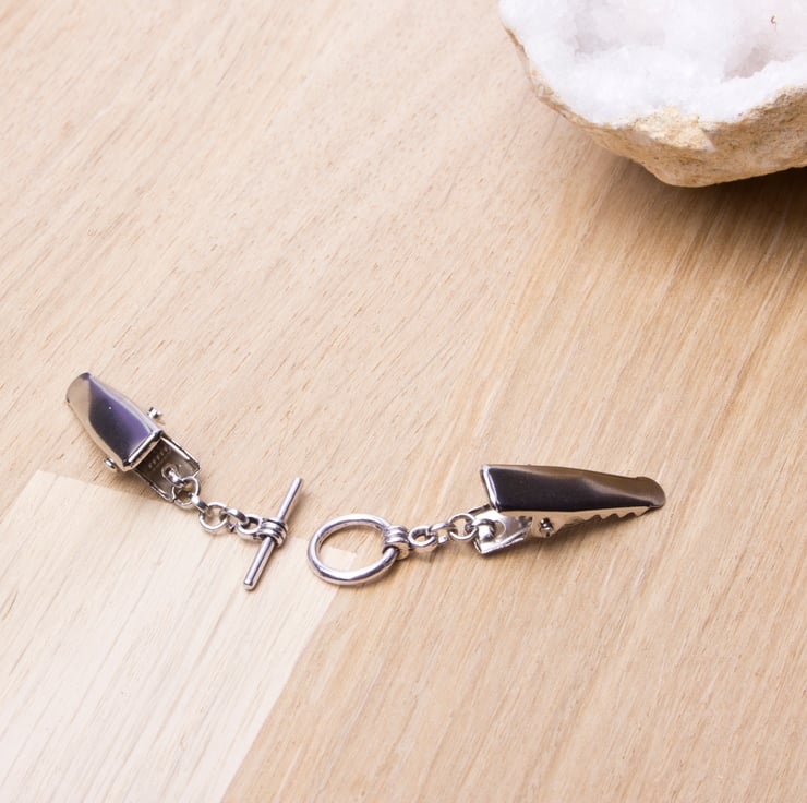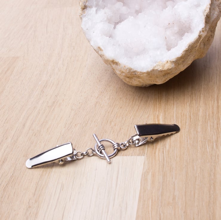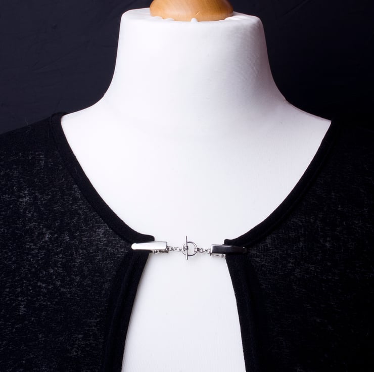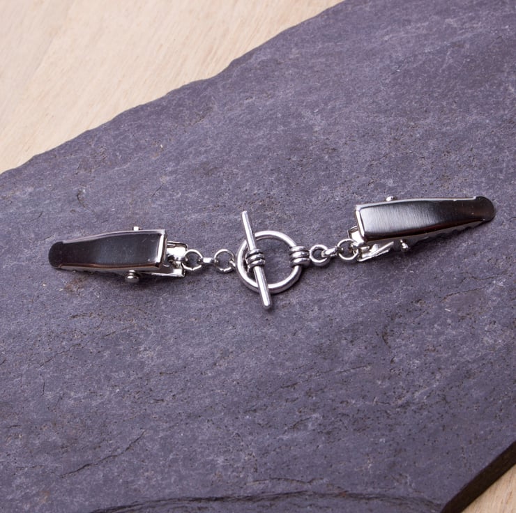 Such a useful little clip chain. The toggle is functional so you can easily unfasten it without removing the clip. It can be used to hold together a buttonless cardigan, shawl or pashmina. You could even use it at the back of a top that is too big to make it more fitted, or as an ID badge holder.