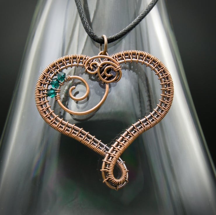 This gorgeous heart pendant has been hand woven from copper wire. Three thicker lengths of wire have been laced together using very fine wire with a flame weave to create an intricate pattern around the curves of the heart shape. I've then finished it by spiralling the ends of the wires & adding 3mm Swarovski® crystal bicone beads. These crystals are Emerald coloured - the colour for May, so it would make a lovely present for a May birthday, or just for someone who loves green!