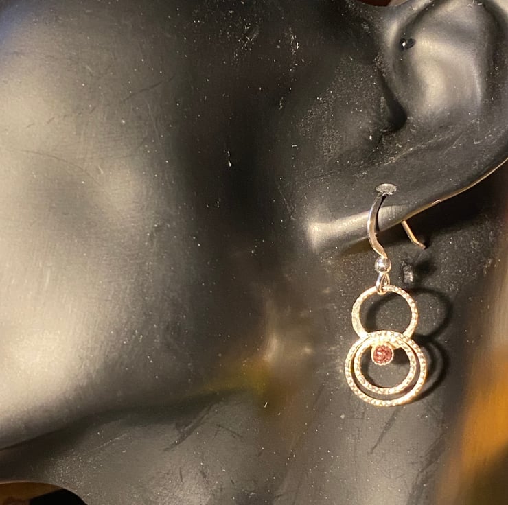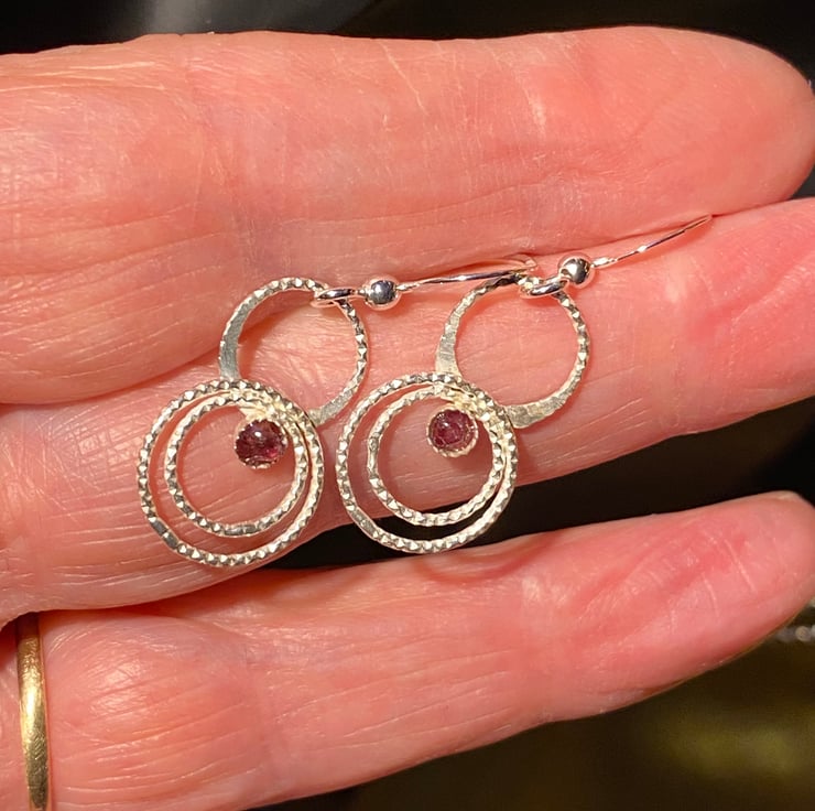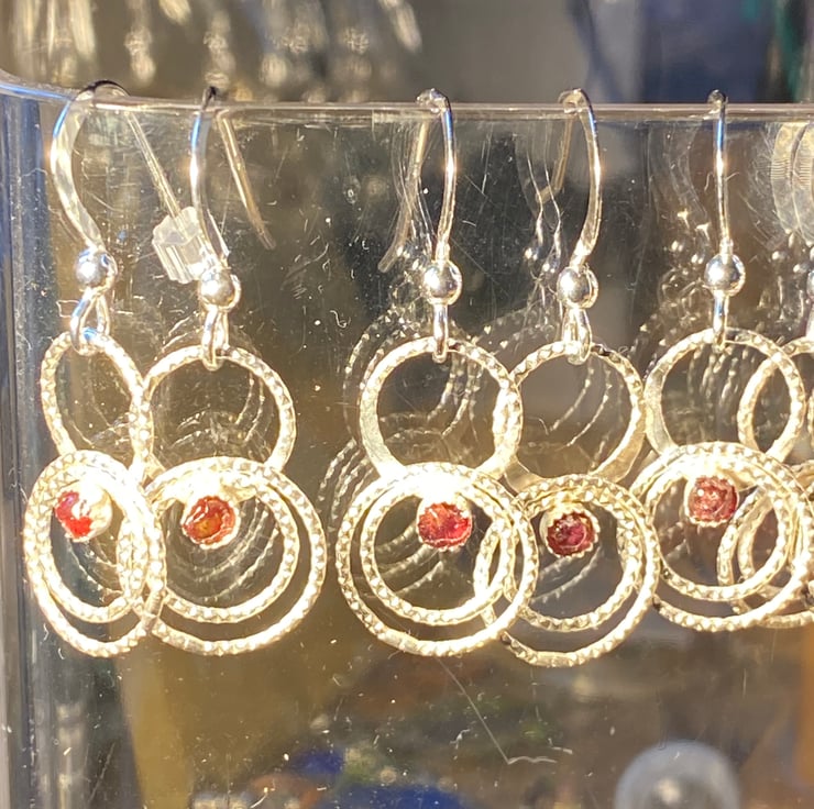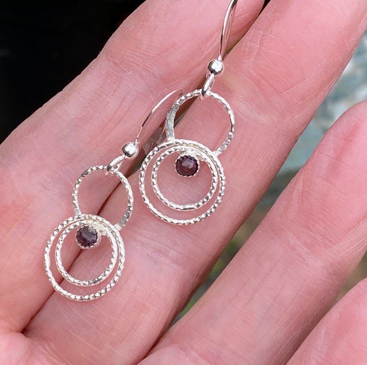 Delicate and pretty sterling silver earrings with little Thames garnets set in pierced bezels to allow the light to shine through and show the lovely colour. The earrings hang from sterling silver earwires and come with earnuts to prevent losing them. Lovely for those who would like to own some Thames garnets because of the mystery and history of these little stones. As always, collected from the Thames foreshore.