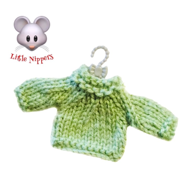 A sweet little pale green jumper made especially to fit the Little Nippers. The jumper is hand-knitted in lovely soft wool and comes on a cute little hanger.