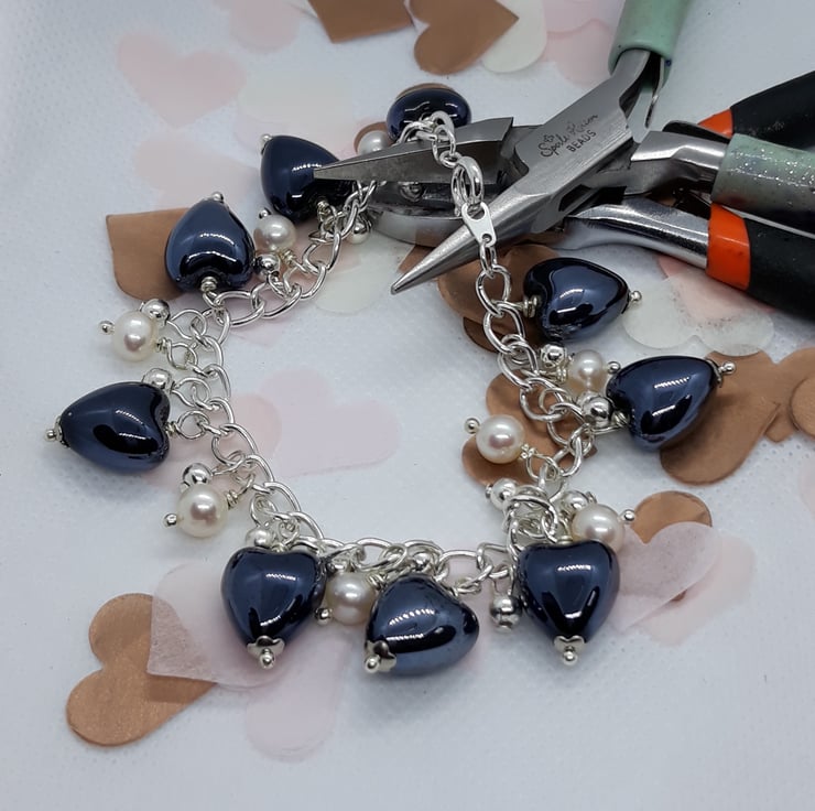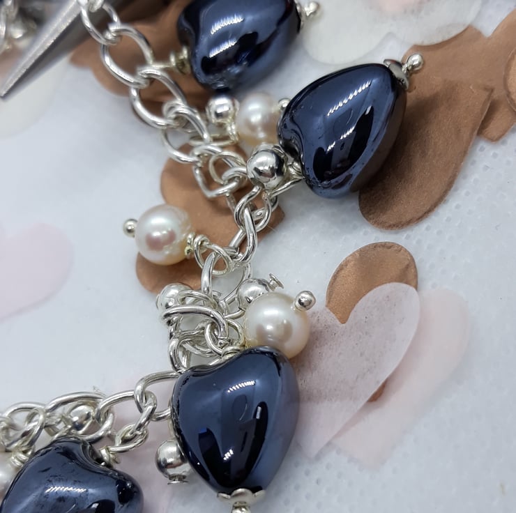 Silver tone open link chain bracelet with deep blue ceramic hearts and fresh water pearls.