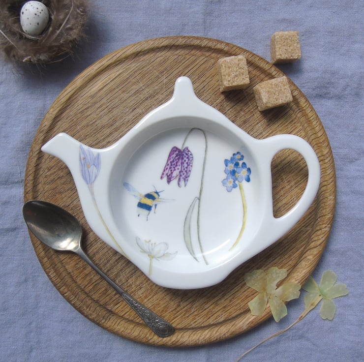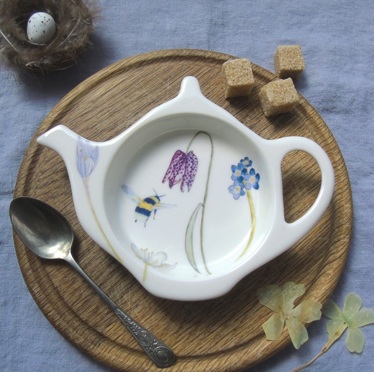 A pretty addition to your kitchen worktop, can equally be used as a spoon rest. My illustrations of a busy bee, snakeshead fritillary, crocus and forget me not have been professionally printed onto ceramic transfers which are cut and applied by hand to compose the finished design. After decorating, the teabag rest is fired in my own small electric kiln to 800°C making it dishwasher safe.