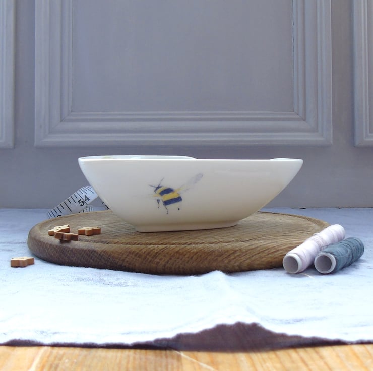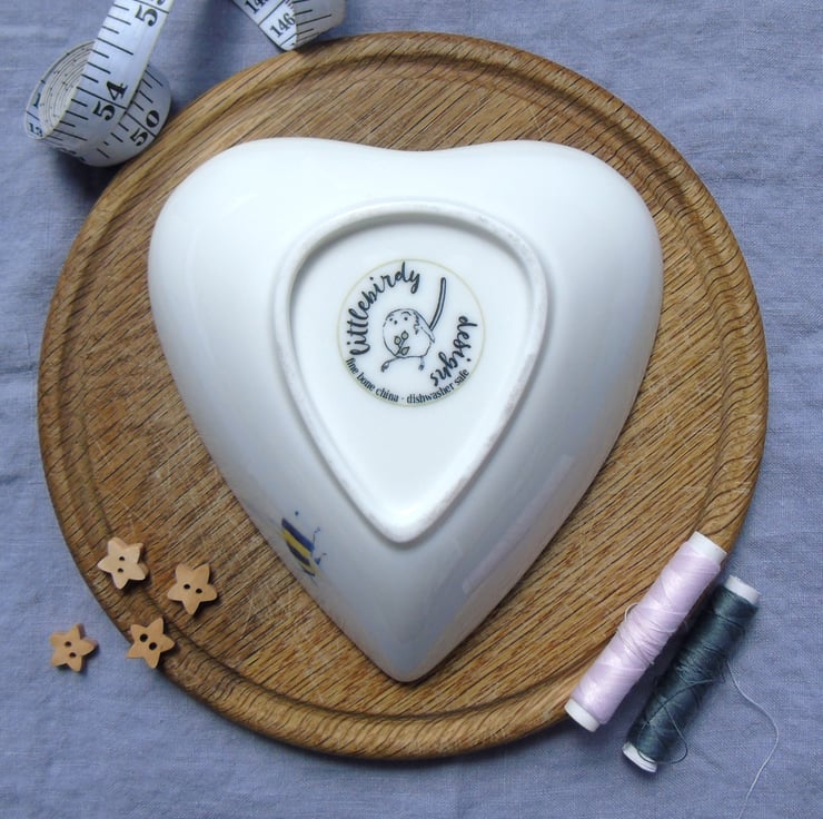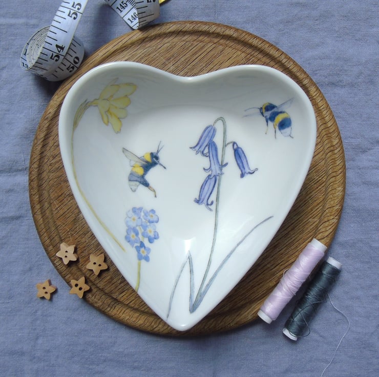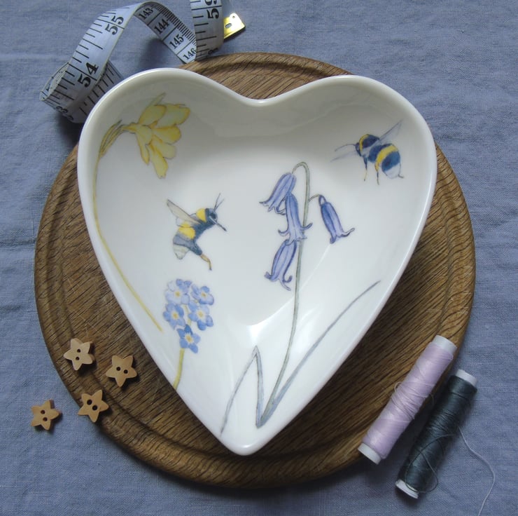 My illustrations of a bluebell, primrose, forget me not and bees are professionally printed onto ceramic transfers which I cut and apply by hand to the bone china heart shaped bowl.