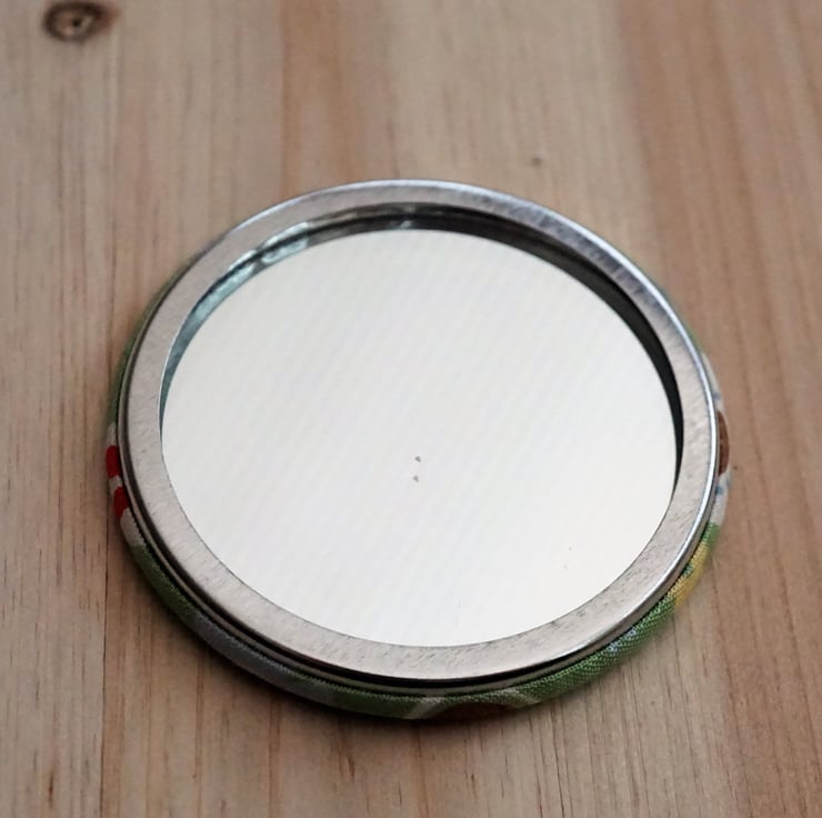 Flowers & butterflies fabric covered pocket mirror. Perfect to tuck away in your pocket or bag. Ideal small gift, thank you gift or why not treat yourself! Each mirror is 58 mm diameter and will come in a organza bag.