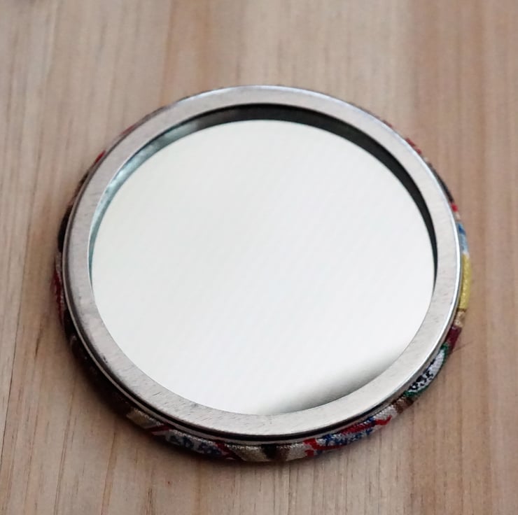 Sewing bobbin fabric covered pocket mirror. Perfect to tuck away in your pocket or bag. Ideal small gift, thank you gift or why not treat yourself! Each mirror is 58 mm diameter and will come in a organza bag.