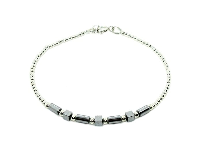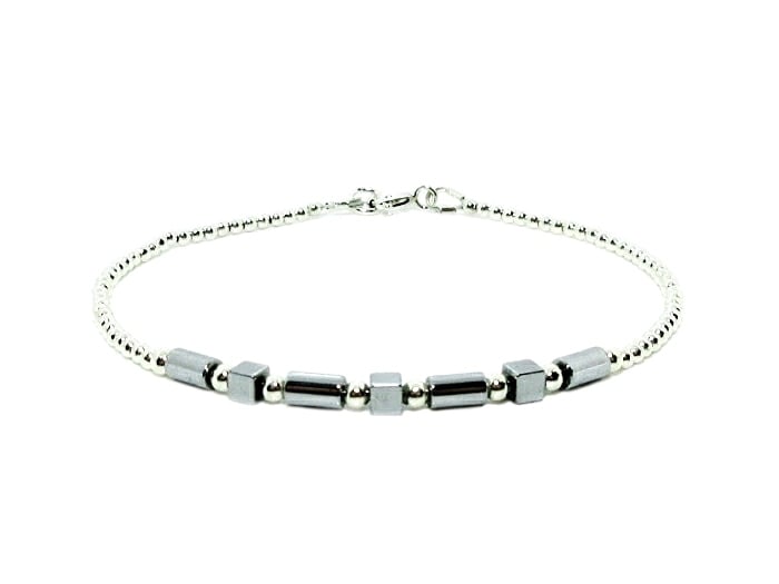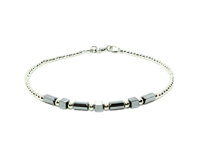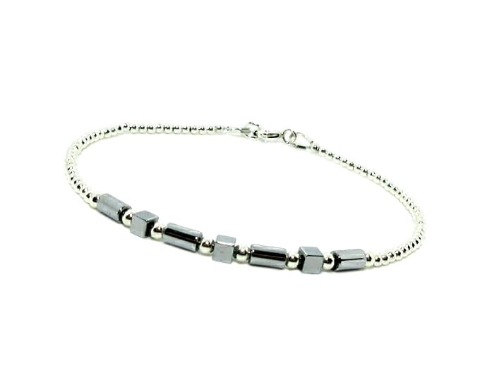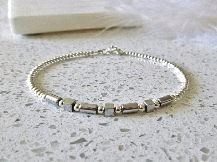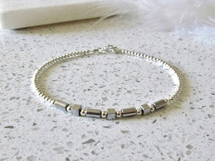 This dainty geometric stacking bracelet has slim Hematite 5mm x 3mm tubes & 3mm cube beads. These Hematite beads have been electroplated with Sterling Silver.