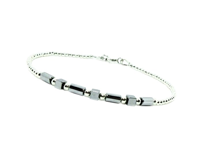Silver Hematite Tubes & Cubes Skinny Geometric Bracelet With Sterling Silver