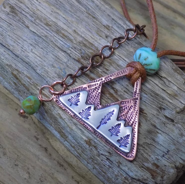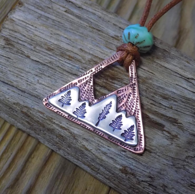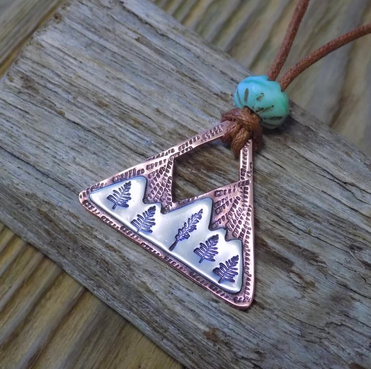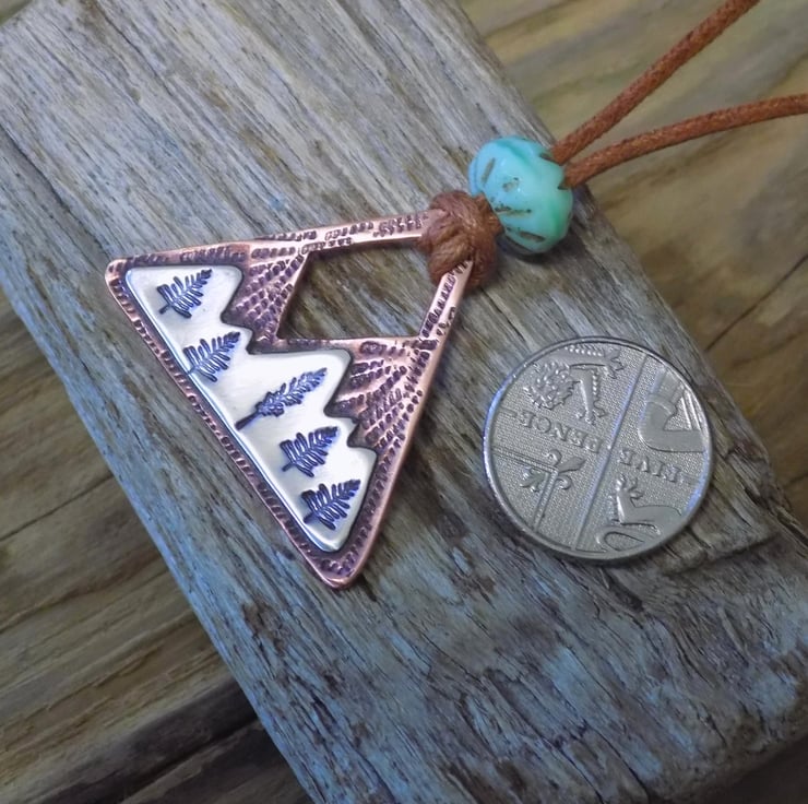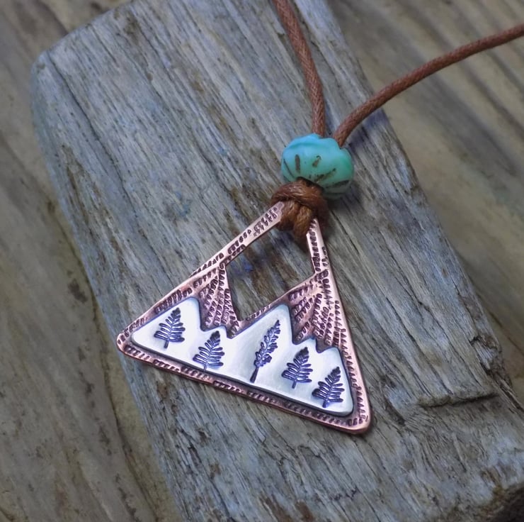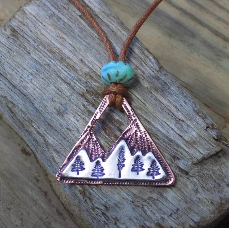 This pendant has been made from thick 1.2mm copper sheet over laid with sterling silver sheet. The silver has been carefully soldered on to the front of the copper which has been stamped with alpine trees among the snowy mountains. The whole pendant has been given an aged effect which picks out all the detail and texture creating a lovely contrast between the silver and copper. Simply hung on waxed brown cotton cord (adjustable) measuring from 16-19 "