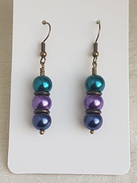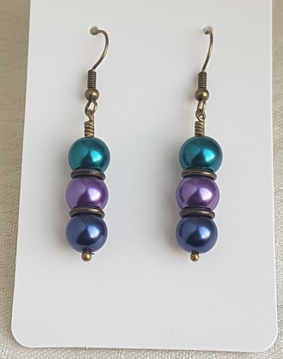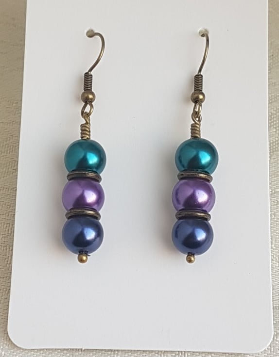 Gorgeous beady earrings. Fabulous Peacock colours of Turquoise, Light Purple, Dark Blue and dark tone metals make these beautiful earrings.