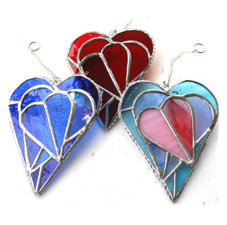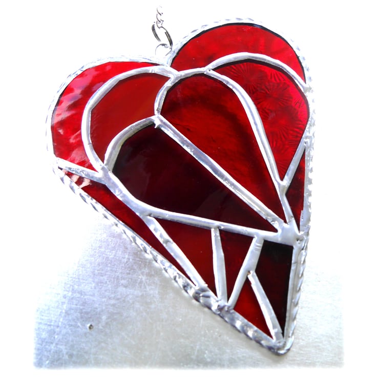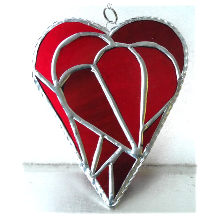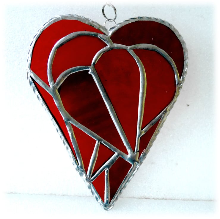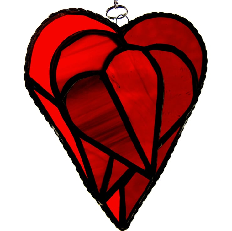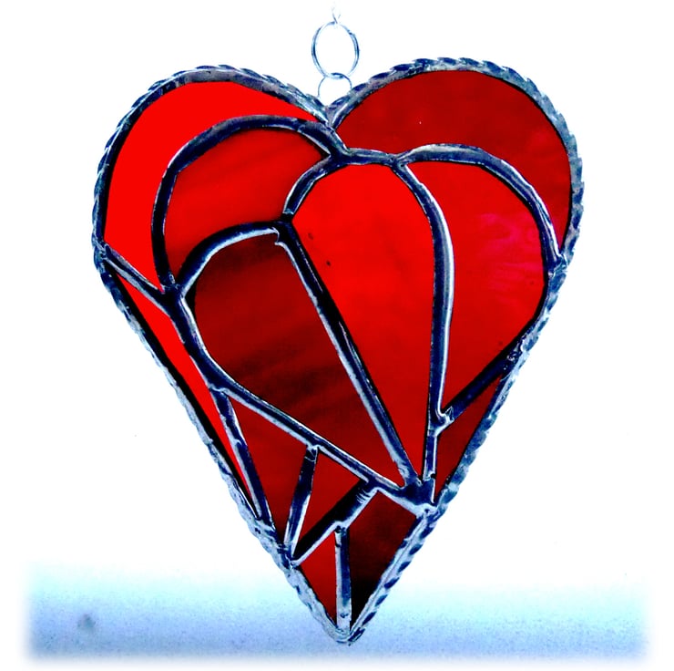 It's a three heart design, each one inside the other. Each heart is made from two different types of red glass making 6 shades and textures of glass in all.