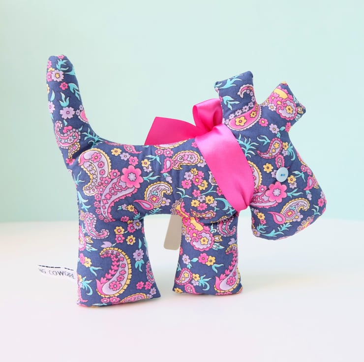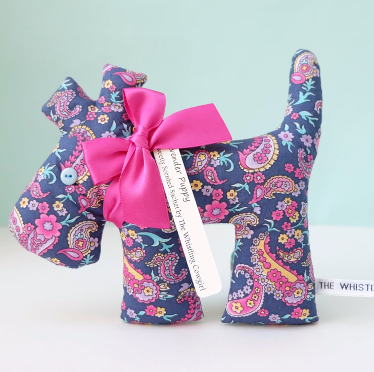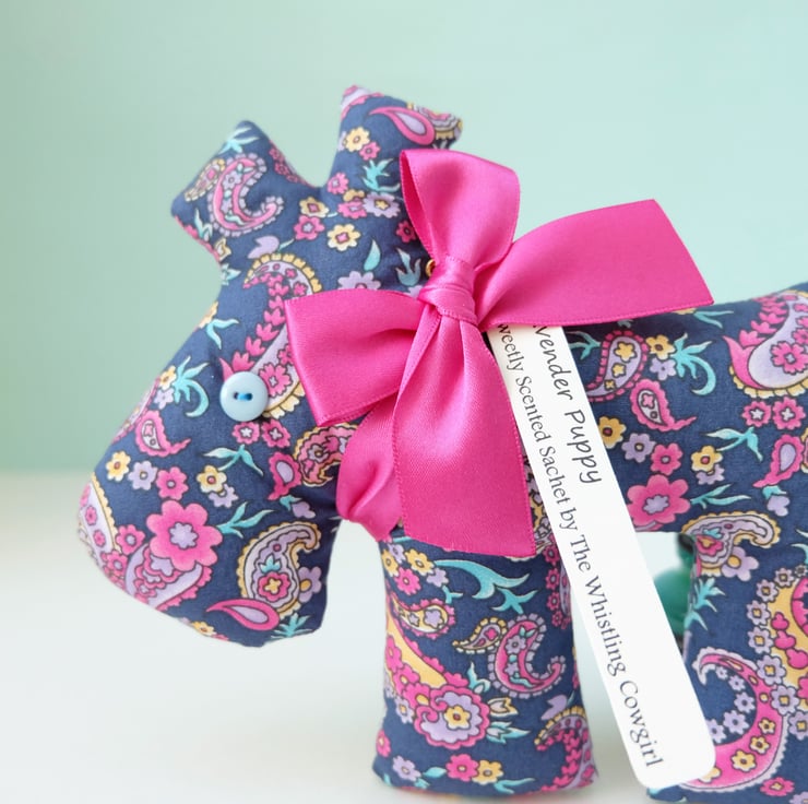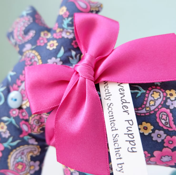 The puppy is made using a navy paisley cotton fabric with bright pink, turquoise, lilac purple and golden yellow accents. It is filled with scoops of fresh, strongly scented lavender grains and toy stuffing for added shape. The eyes are little plastic blue buttons and it has a lovely dark pink satin ribbon around its neck, along with a card label.