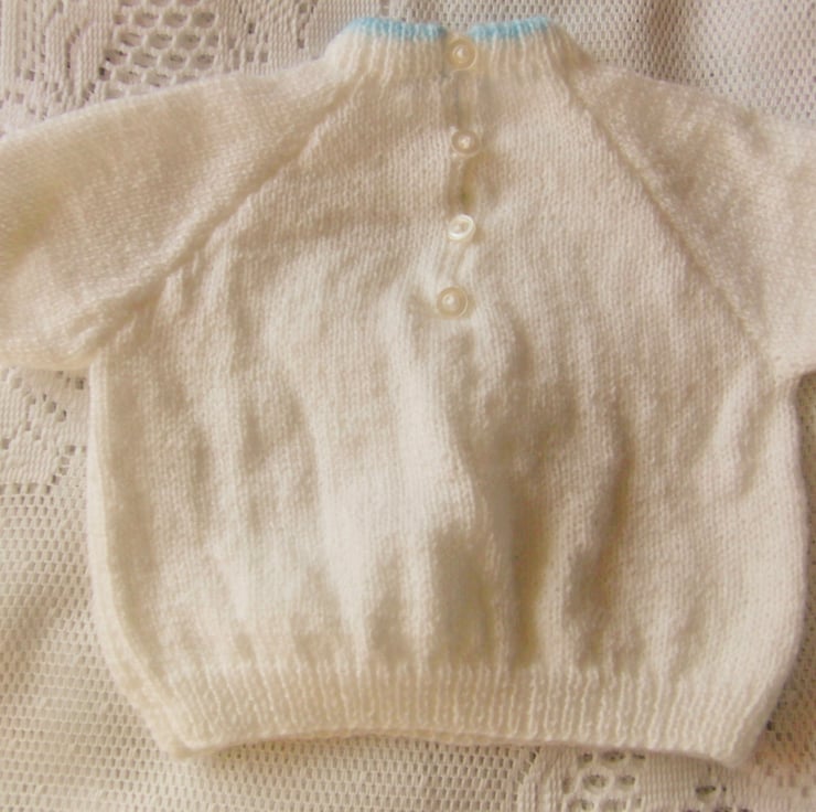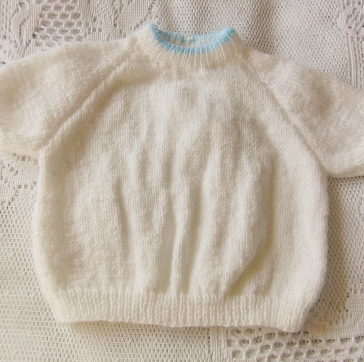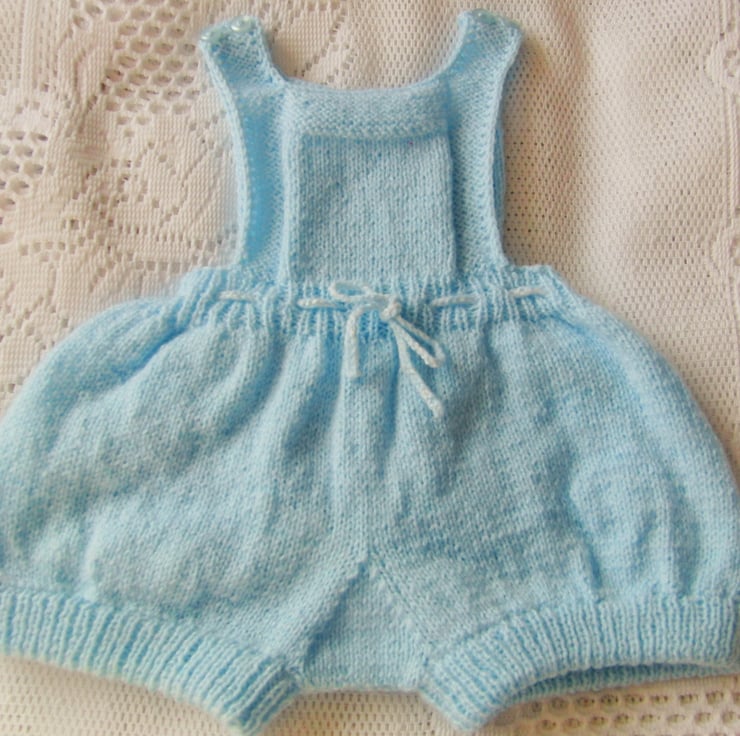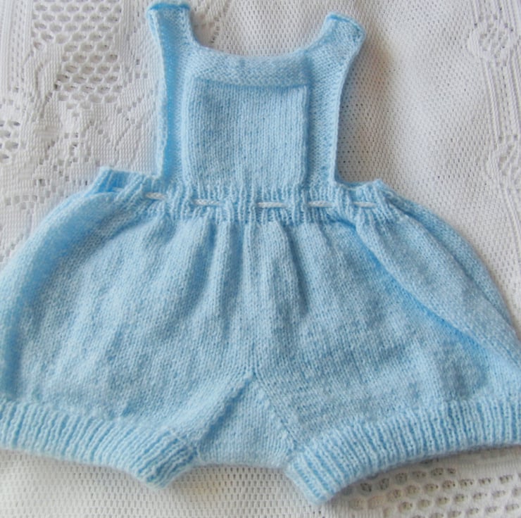 This set is currently in stock and is available in pale blue and white, as shown in the photos, to fit a baby 3 - 6 months old, chest size 18 inches. It would make an ideal gift for a new born baby, a baby shower or as a Christening gift.