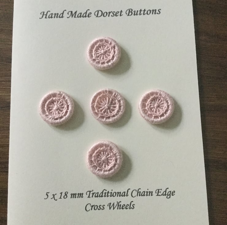 This set of hand worked Dorset Cross Wheel Buttons is created using pale pink coloured cotton thread in the traditional style with a chain ridge edging.