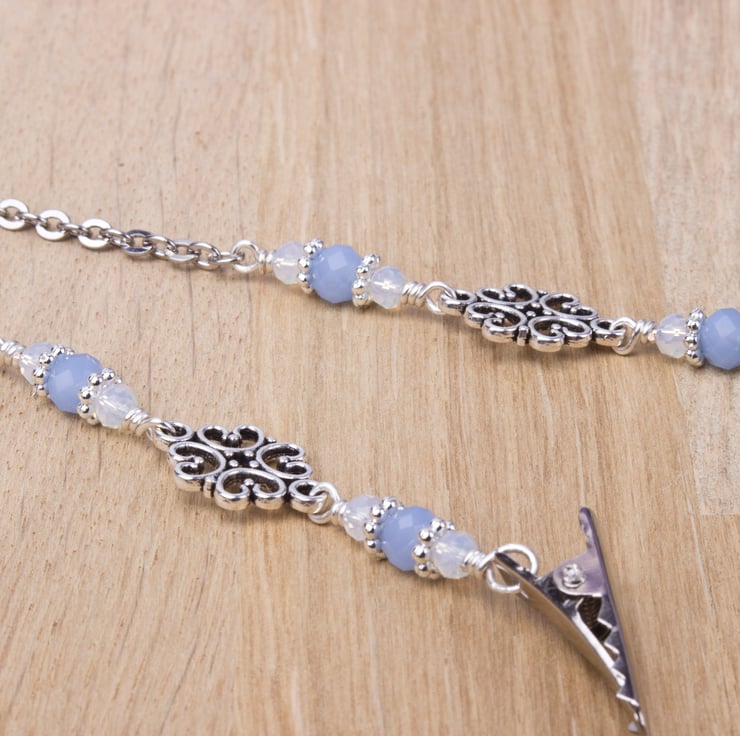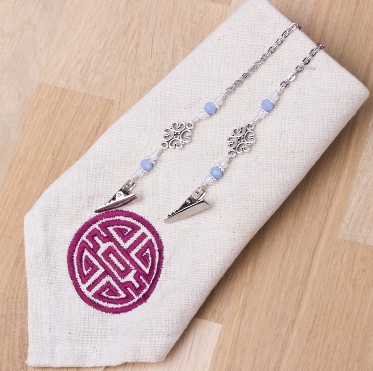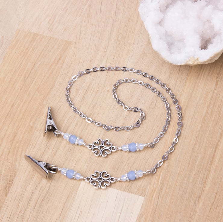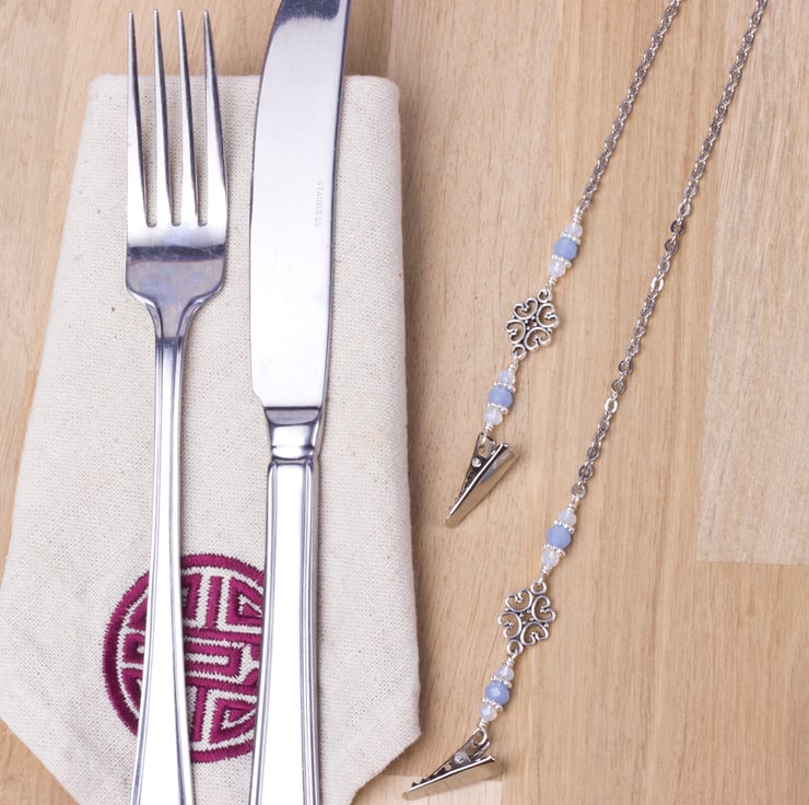 This pretty napkin chain with blue and opalite glass beads will save you worrying about splashes and spills. The beads are linked into a silver-tone oval link chain, combined with Tibetan silver fancy links and finished with clips to hold your napkin safely in place. Approximately 20 inches long (inc napkin clips)