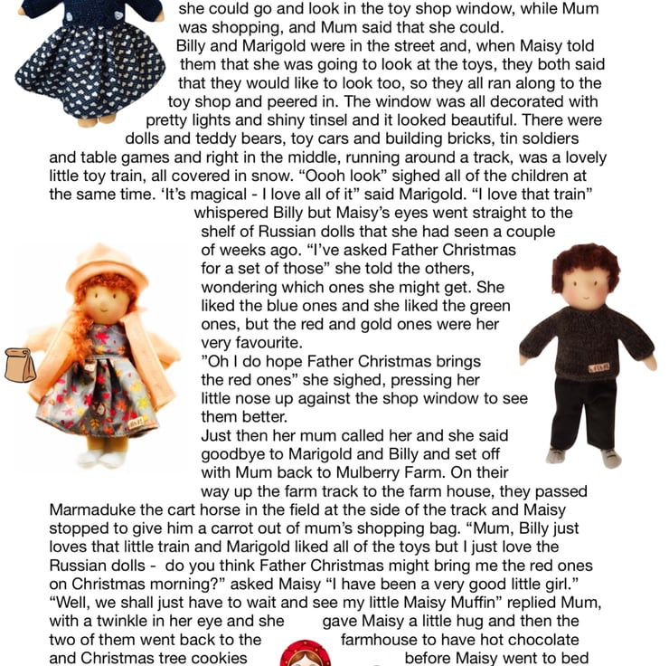 There are other children in Maisy’s class at school - Violet, Billy with his pet rabbit, Amber, Tilly, Rosie and her kittens, Amelia, Ruby, Marigold, Bobby with Max the dog, and the twins Oliver and Olivia, who have a puppy called Oscar. The dolls are all 26cm tall and baby Daisy is 16cm. Maisy and Mo love nothing more than having adventures with their friends. You can read about their adventures on my Facebook and Instagram pages - Maisy Muffin Rag Dolls and on my Mulberry Green Pinterest boards.