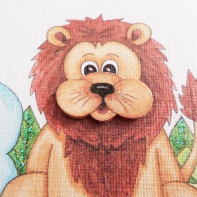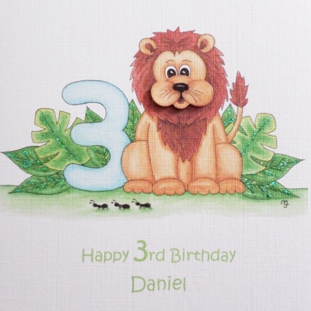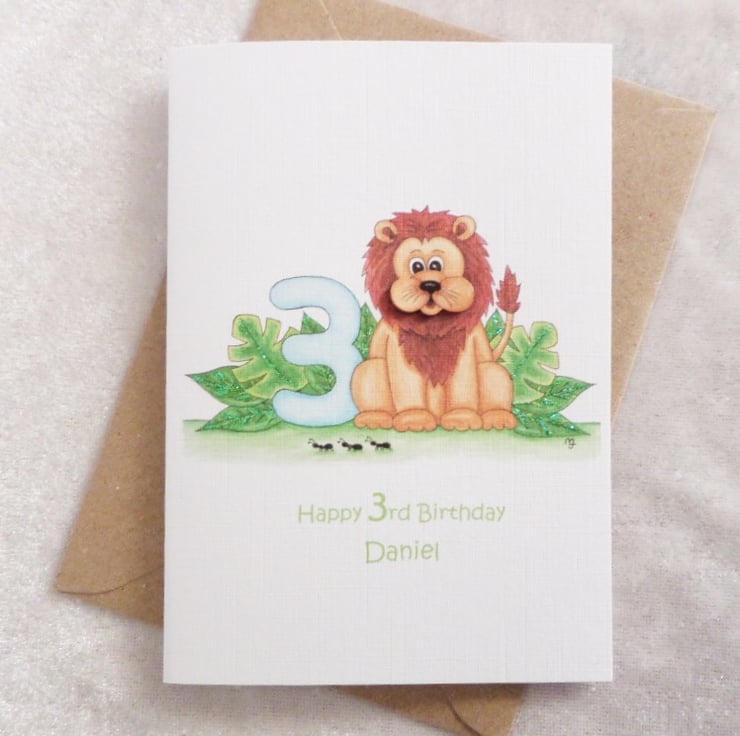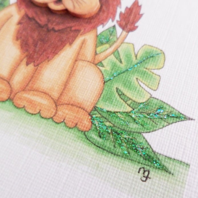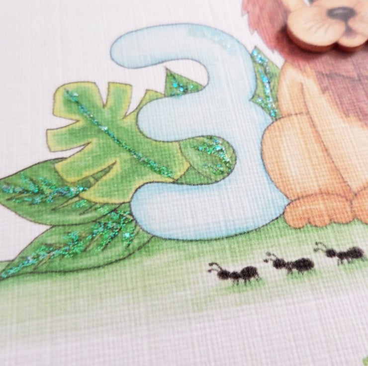 This cute 'Lion’ 3rd Birthday card has been designed using my own original watercolour illustration. The card has been printed out and embellished with glitter detail on the green leaves. The lions face has been cut out by hand and decoupaged to give him dimension.