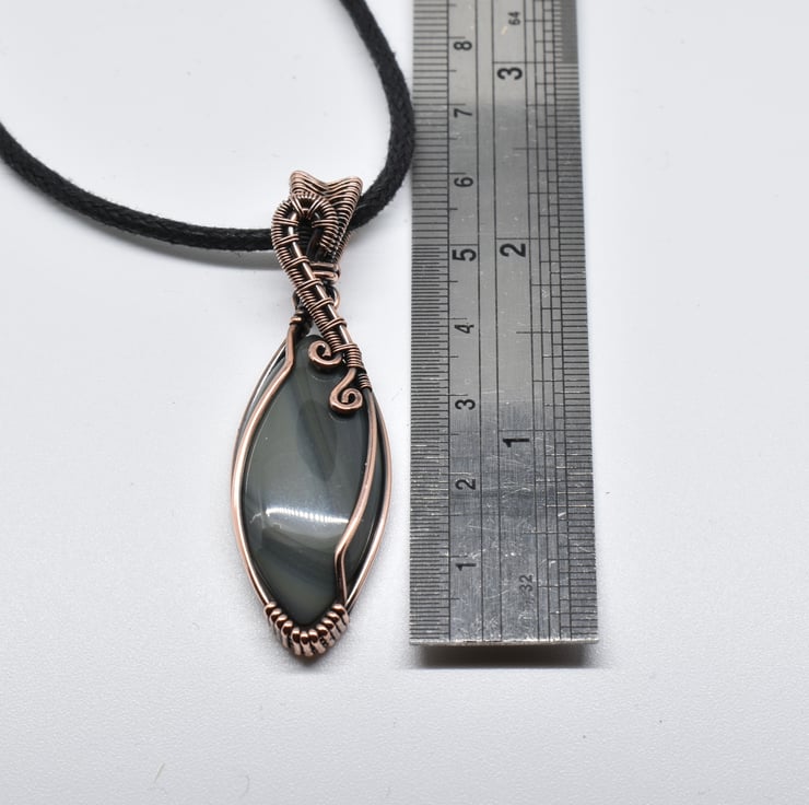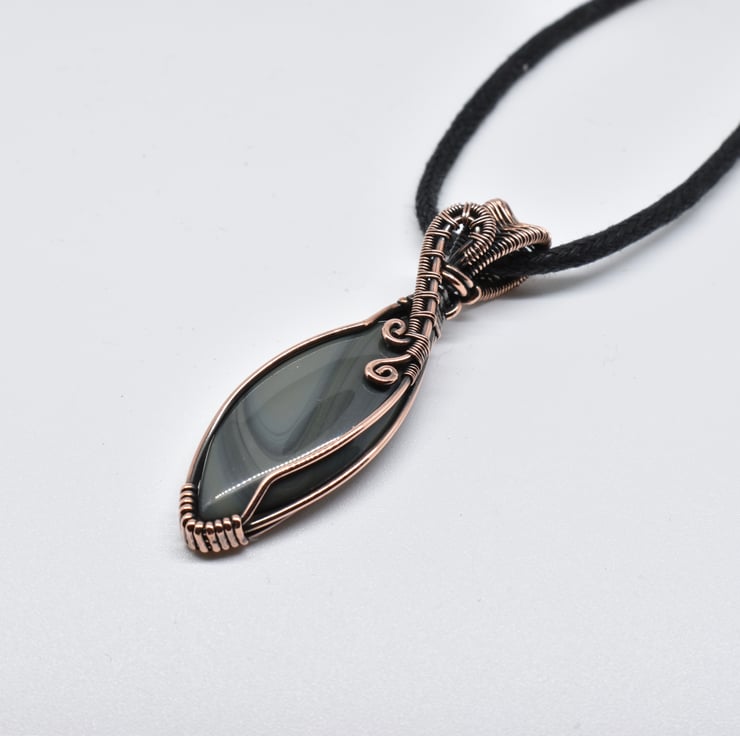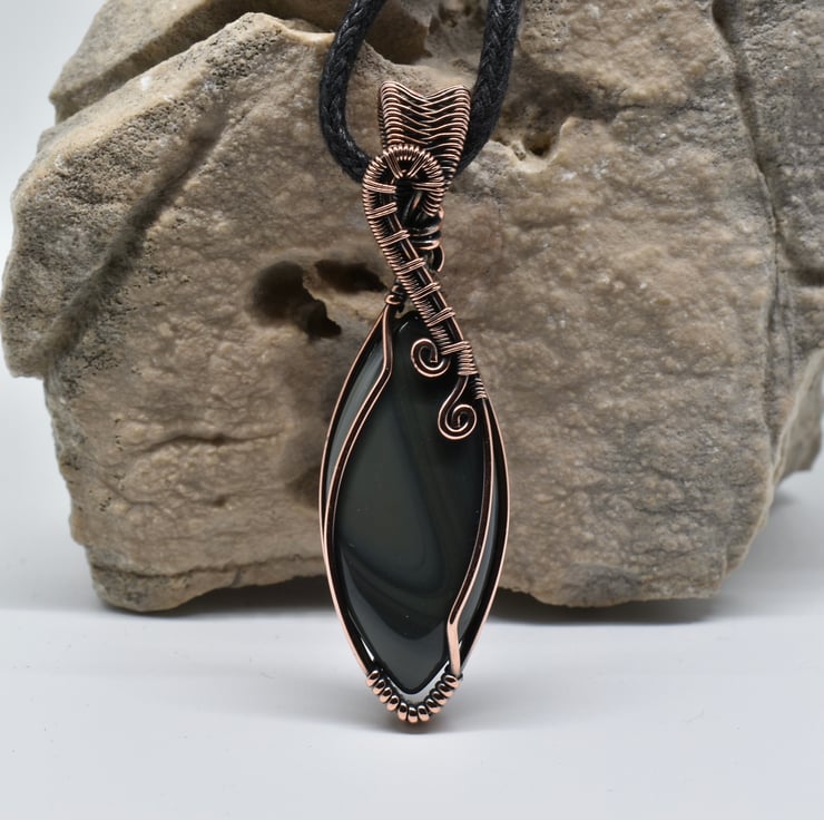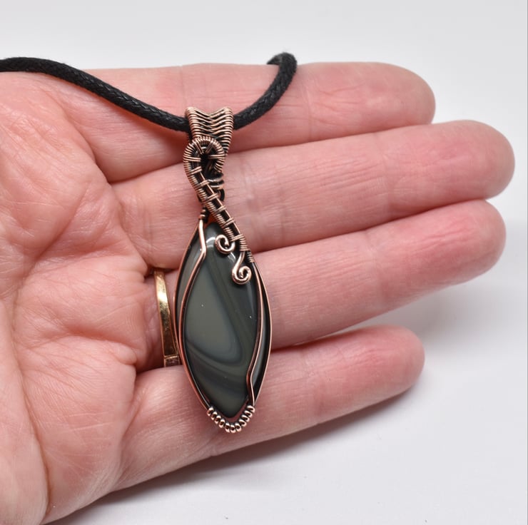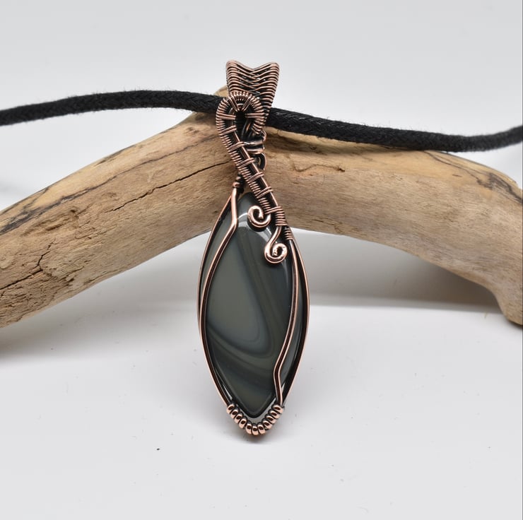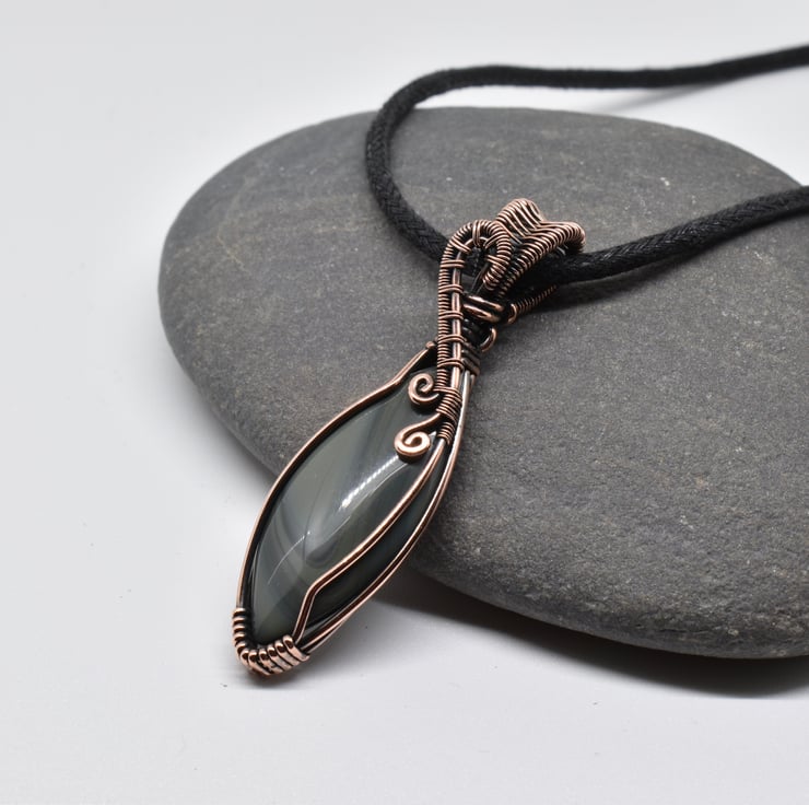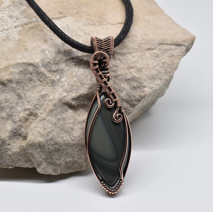 I have wire wrapped and woven around this striking banded agate marquise shaped cabochon using solid copper wire to make this unisex pendant.
