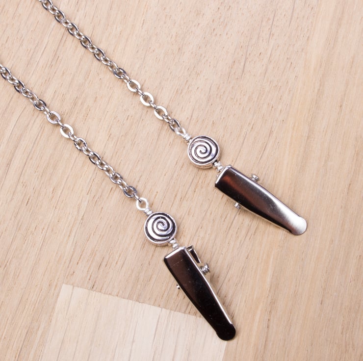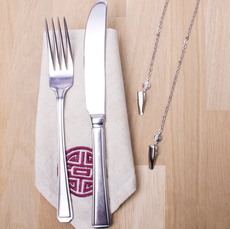 This elegant napkin chain with Tibetan silver spiral design features will save you worrying about splashes and spills. The spiral is linked into a silver-tone oval link chain and finished with clips to hold your napkin safely in place. Approximately 20 inches long (inc napkin clips) - can be shortened on request.