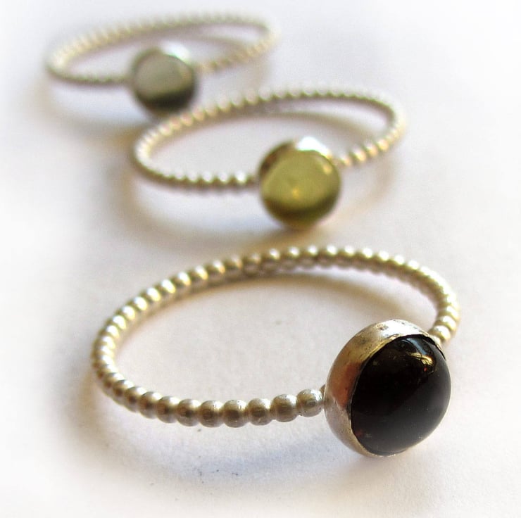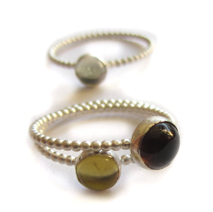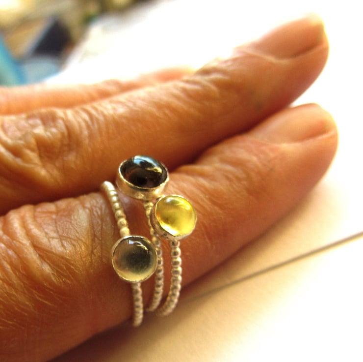 Be timeless with this lovely trio of rings lemon quartz, prasiolite (pale green quartz), quartz smoke set in sterling silver, An elegant classic.