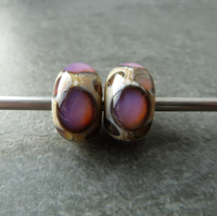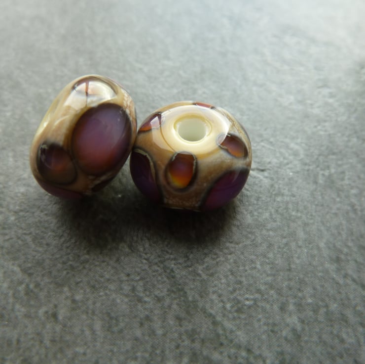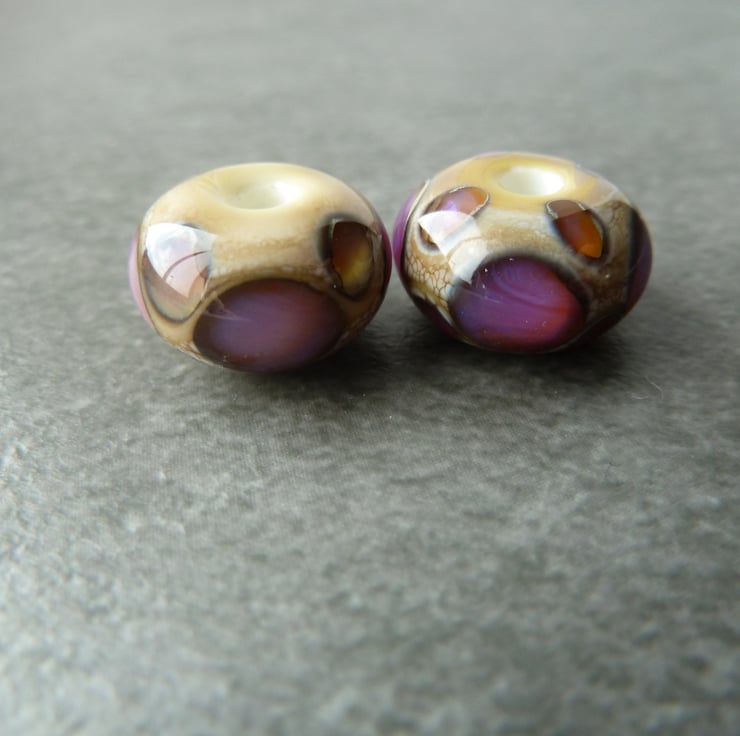 A pair of lampwork glass beads made with ivory glass and featuring lilac silver glass spots.