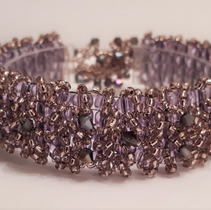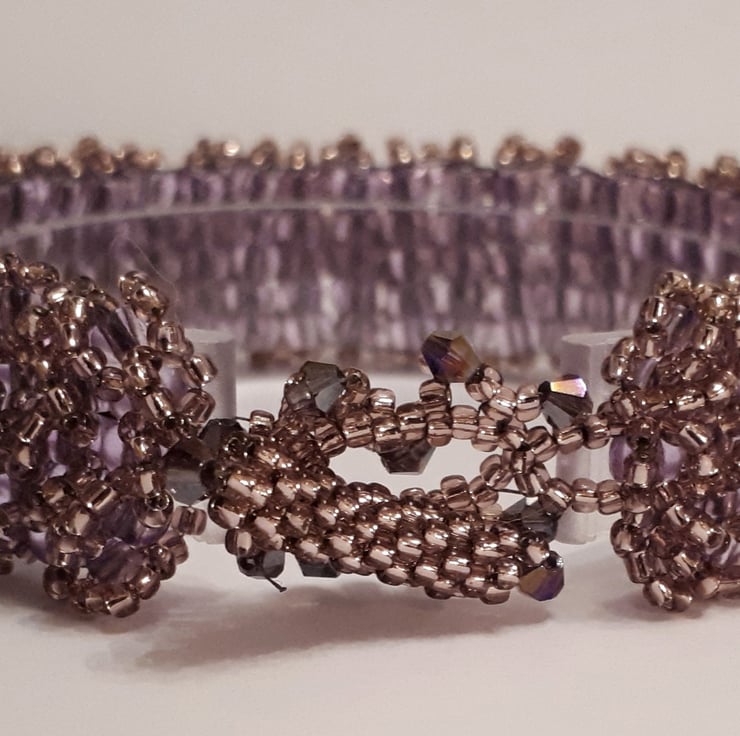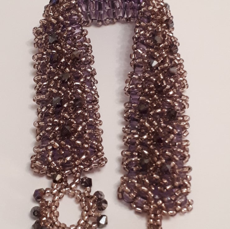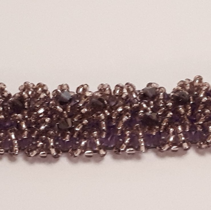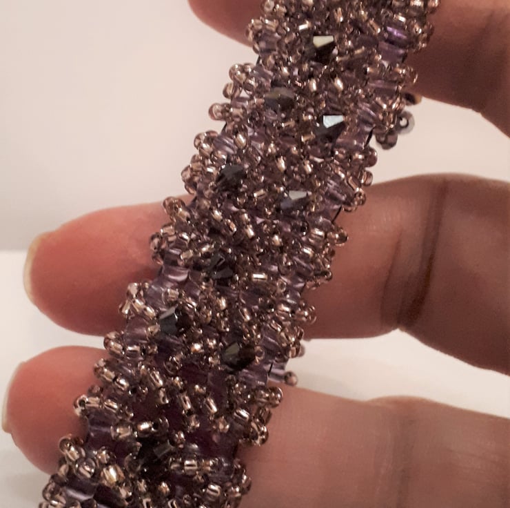 This bracelet is made up a base of purple colour seed beads embellished with smaller purple, silver lined seed beads and purple crystals. The crystals catch the light as the bracelet moves when you are wearing it but are not overpowering or garish. Looks brownish in the photo but is definitely a dark shade of purple. Based on a design by Kelly Dalton Dale.
