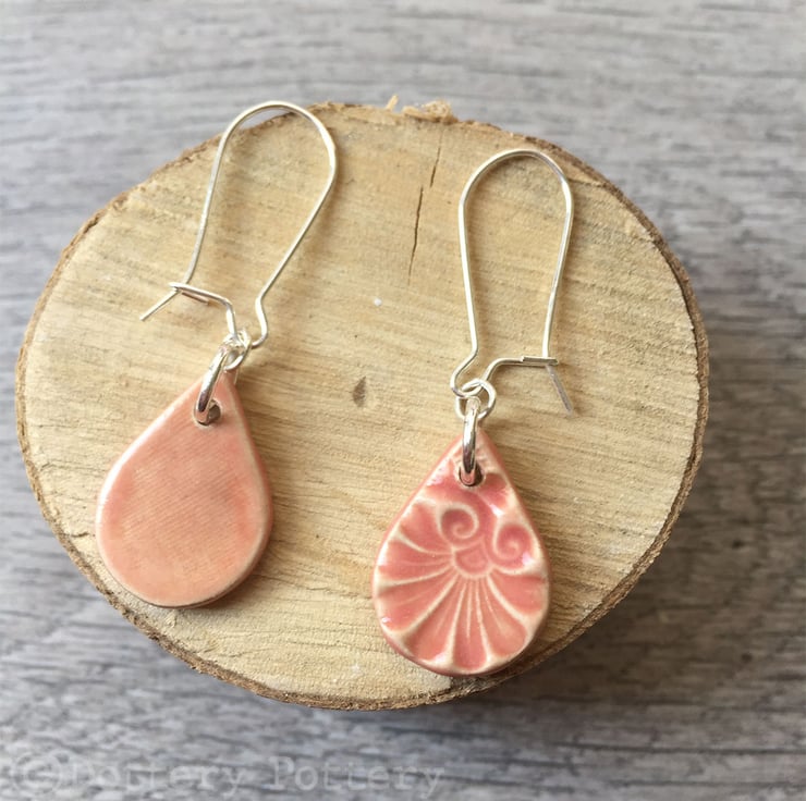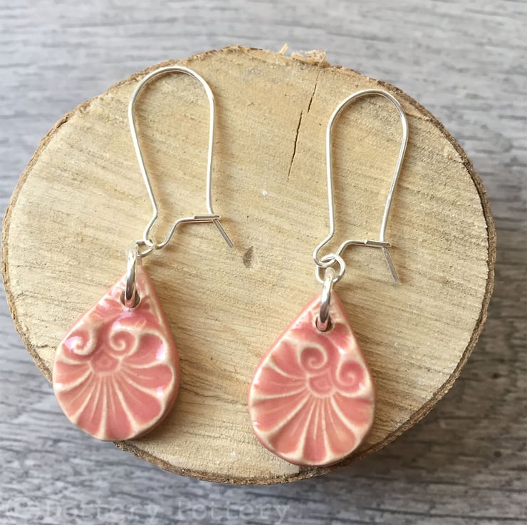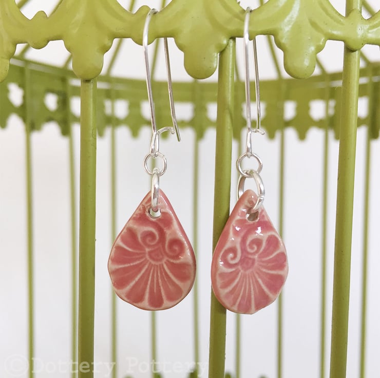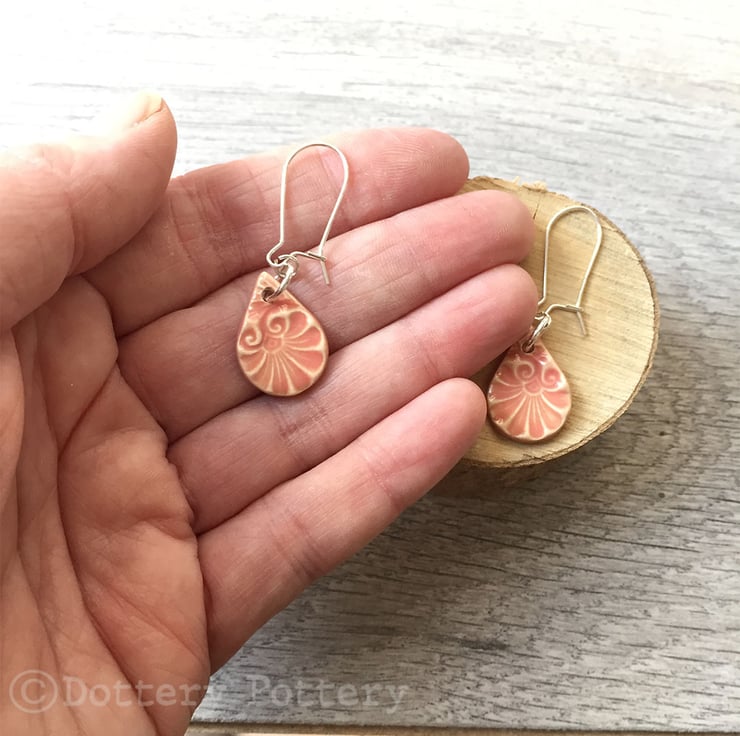 These earrings have been made from white earthenware clay and are imprinted with pattern. They have then been fired once, glazed in a bright, shiny glaze on both sides and then fired in the kiln for a second time. They hang from sterling silver ear wires with a clasp at the back. The ceramic teardrop measures 1.8 x 2cm and from the top of the ear wire to the bottom of the bead measures 4cm. They will come presented in a small organza pouch and shipped in a sturdy, large letter box.