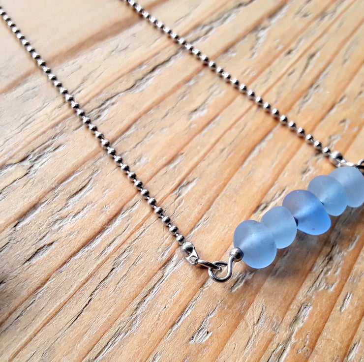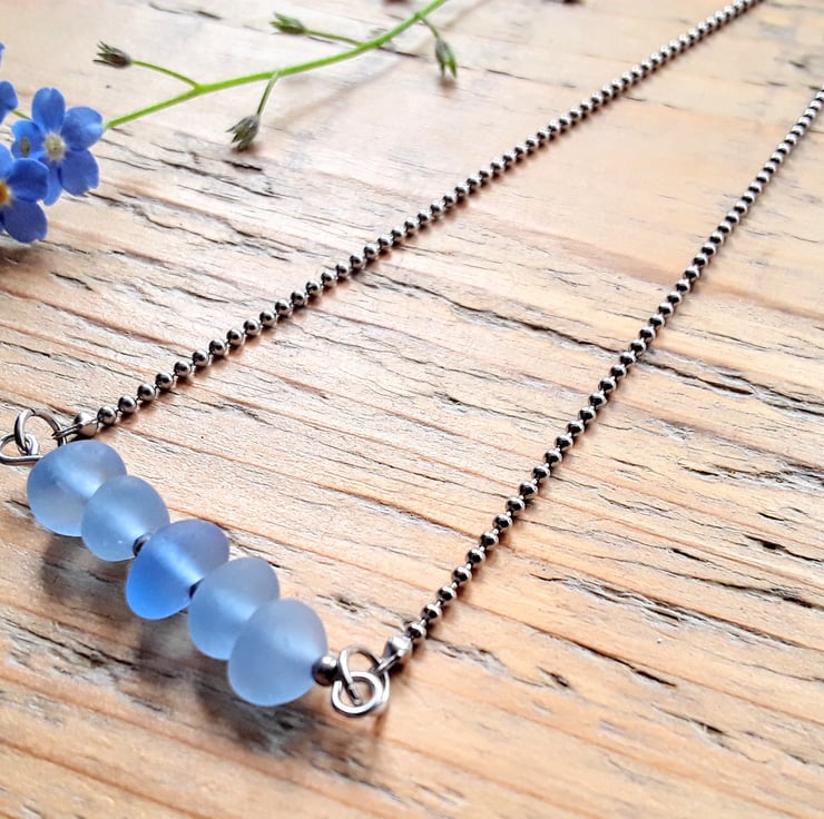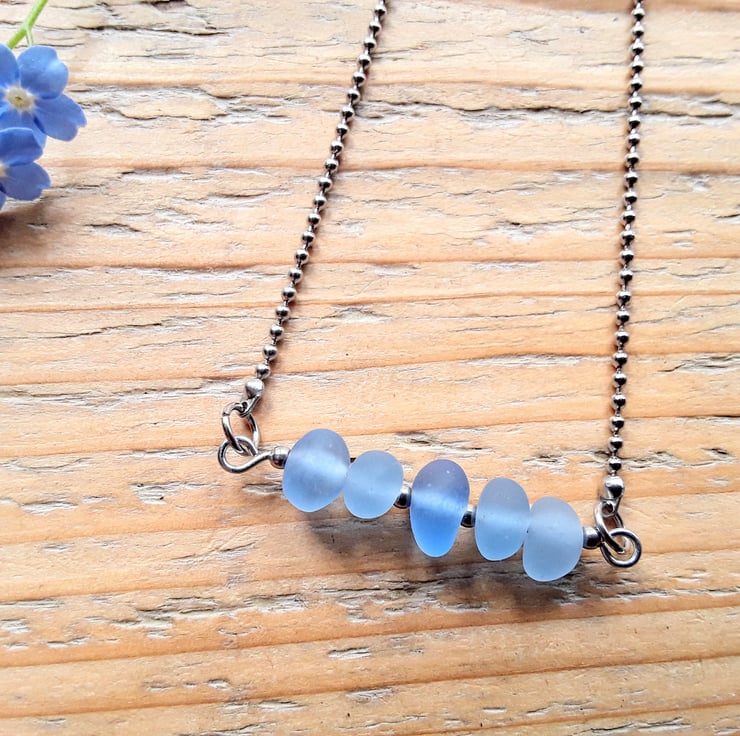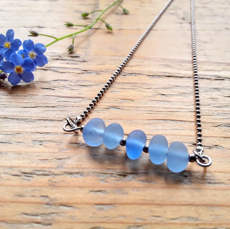 5 beautifully smooth and small nuggets (about the size of a petit pois!) of forget-me-not blue seaglass have been hand-drilled to create this pretty, horizontal stacked pendant. One tiny stainless steel bead has been placed either side of the central seaglass nugget.
