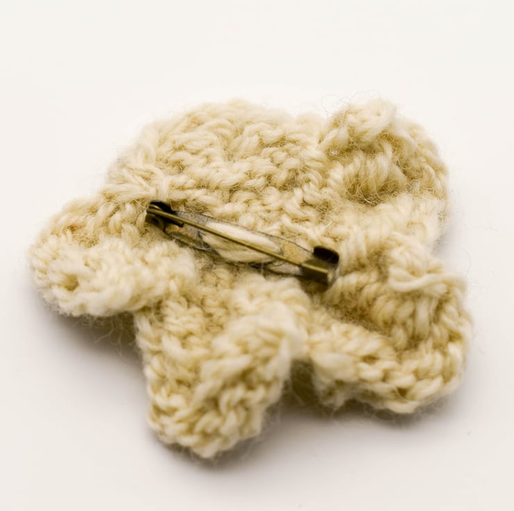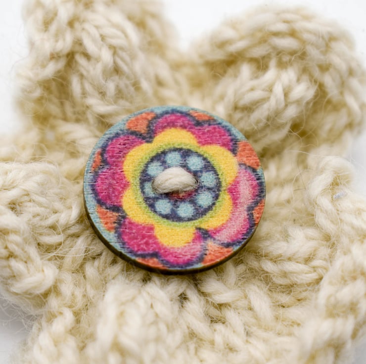 Knitted in a pale cream merino wool, the five petal flower is hand sewn with floral design printed wooden button and the brooch bar pin safely secured at the back.