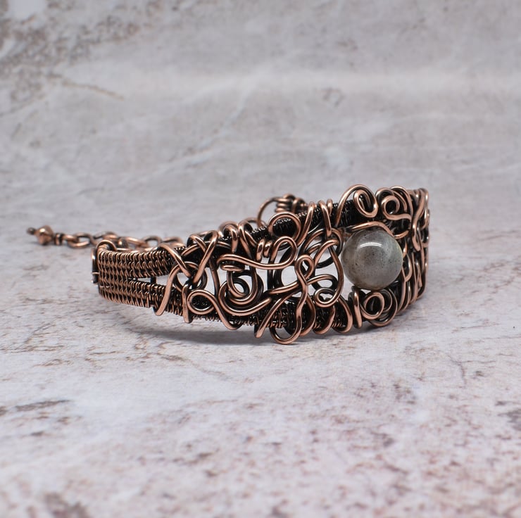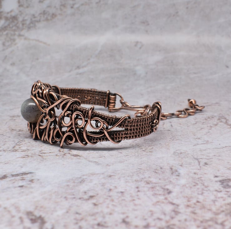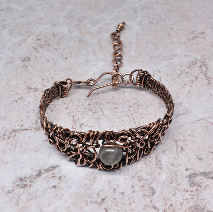 I have wire wrapped and woven this bracelet in solid copper wire with a lavradorite bead at the centre and a handmade clasp with chain to close.