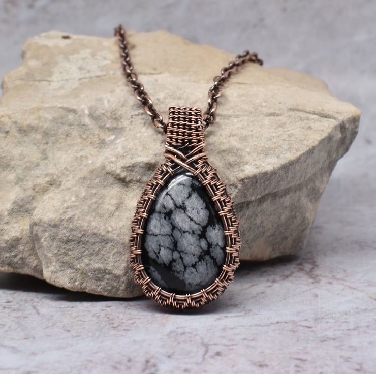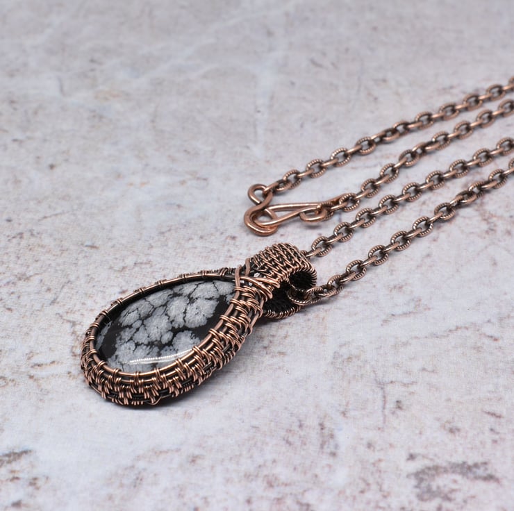 I have hand woven around this snowflake obsidian cabochon in solid copper wire to make this striking necklace which hangs from a copper chain with handmade clasp.