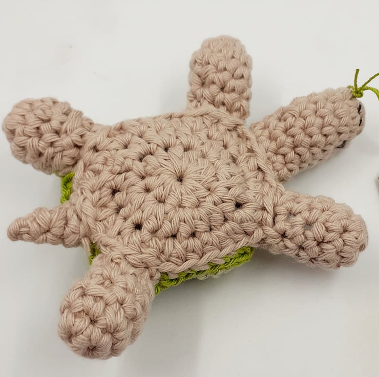 This little tortoise is all set to deliver (in his own time) a message on your behalf and would make a novel keepsake alternative to a greetings card . It is crocheted in cotton and the shell is lightly filled with polyester stuffing inside a felt casing to prevent it from showing through.
