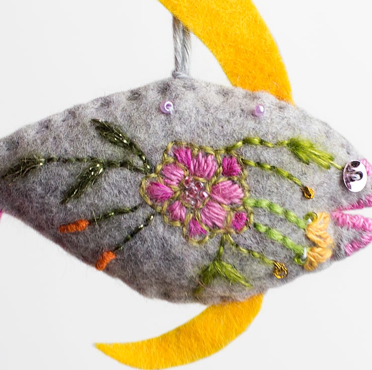 Please welcome Big Gilbert - a fish shaped bag charm/ornament. Big Gilbert has been made out of colourful felt fabric and his body is hand embroidered with a floral design. He has a wool loop attached for hanging or display - he can be used as a bag charm or ornament.
