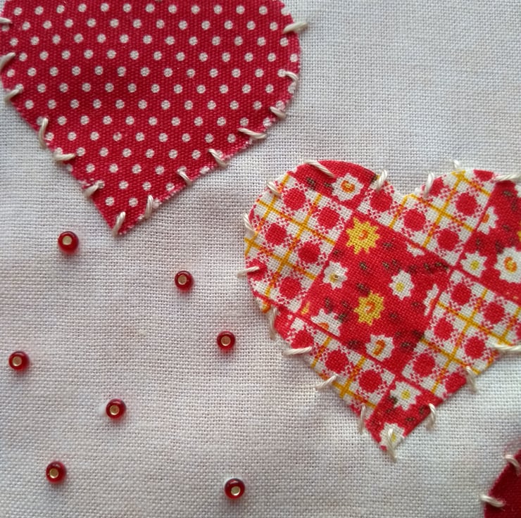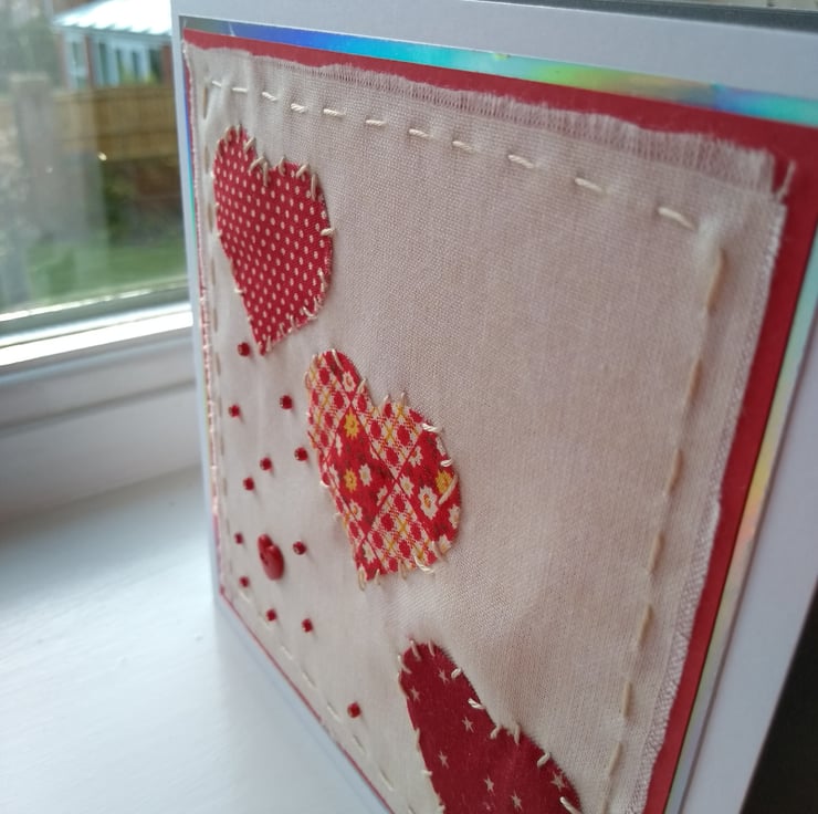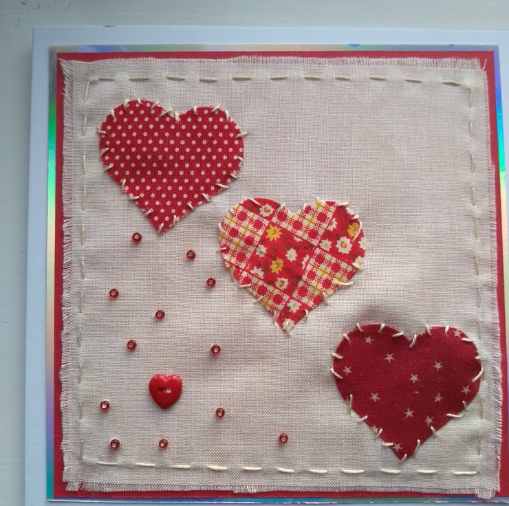 A completely handmade and uniquely designed card. Consisting of three hearts cut from 100% cotton and randomly stitched onto Calico. Hand stitched edging. Finished off with red heart and red beads. Mounted onto red then silver mirri then quality pristine white card