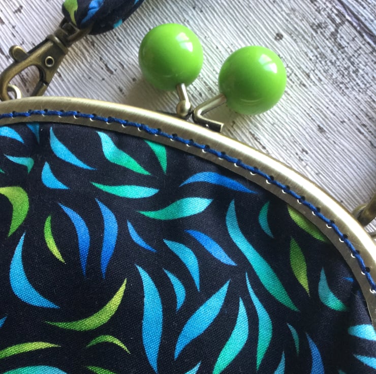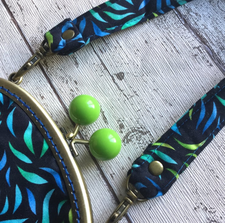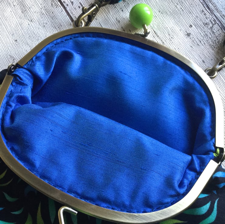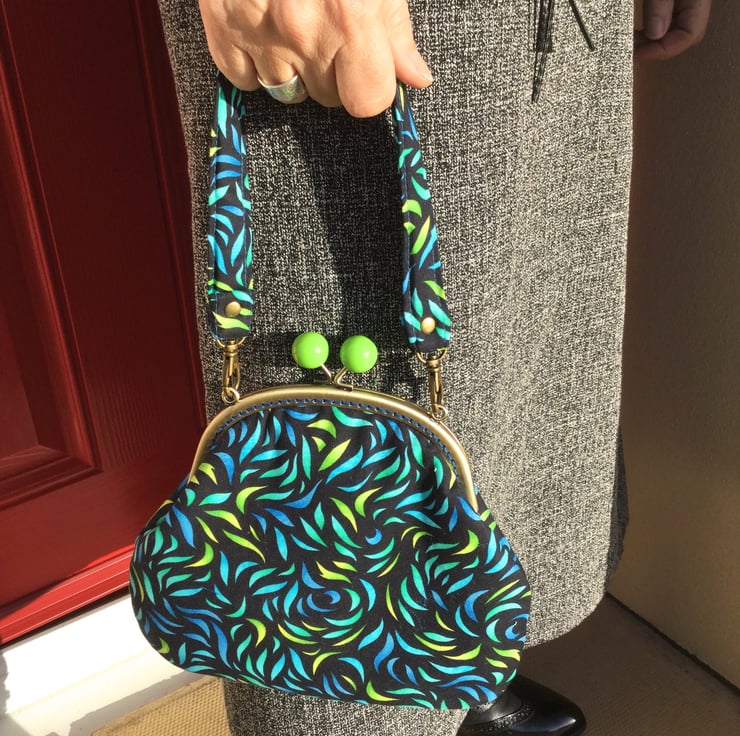 This classic handbag is created from a navy cotton fabric with a design of swirls in shades of blue, green and yellow. The antique bronze coloured metal clasp has two apple green bobbles as closure and the frame is attached to the bag with a navy embroidery thread.
