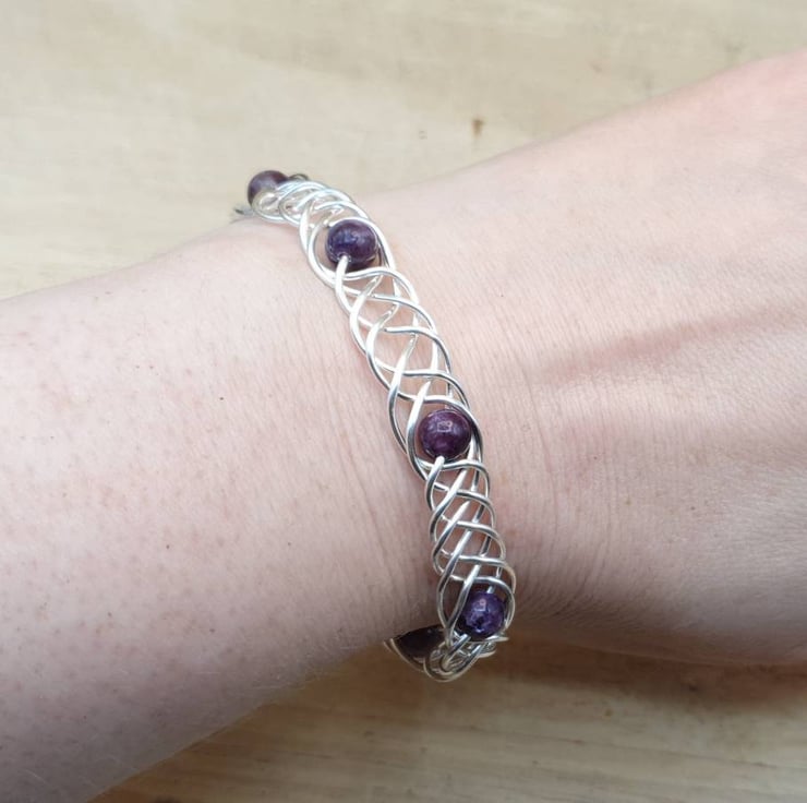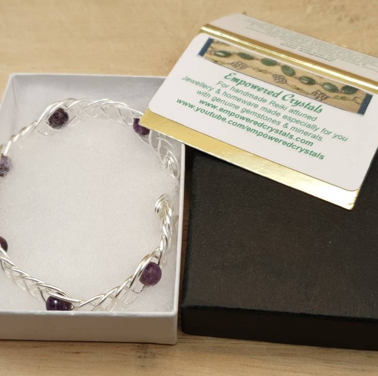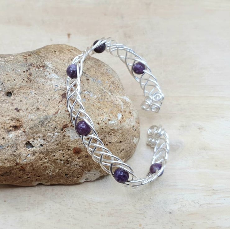This is a purple lepidolite adjustable cuff bracelet. Wire wrapped with silver filled wire.