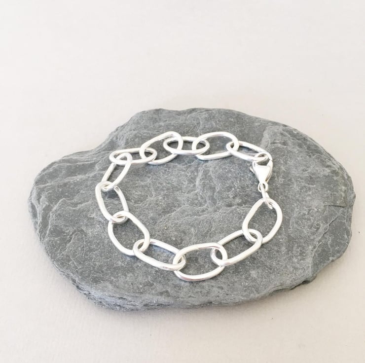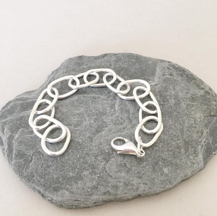 This bracelet is made from sterling silver wire, formed and shaped into oval links.