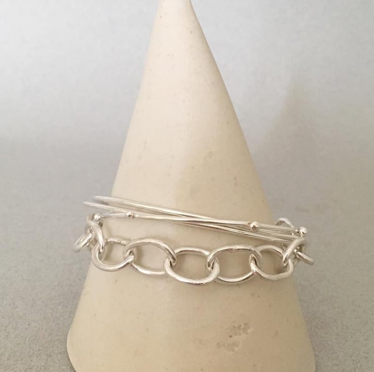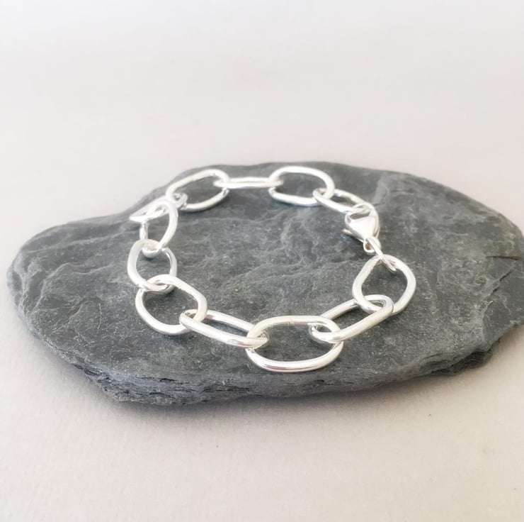 It's a chunky, solid silver piece that is substantial and noticeable -- and will be a great addition to your jewellery collection. You can add charms to it if you wish, or wear it just as it is.