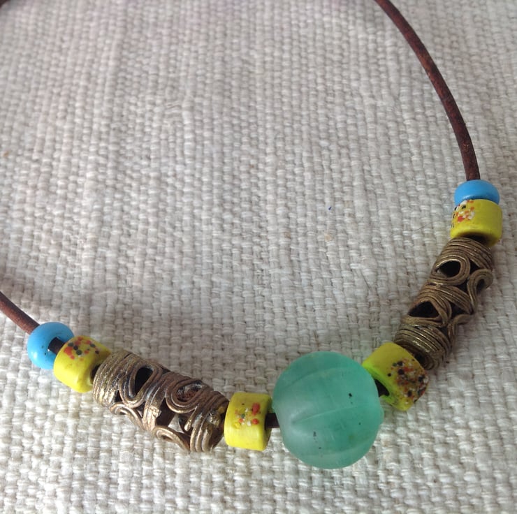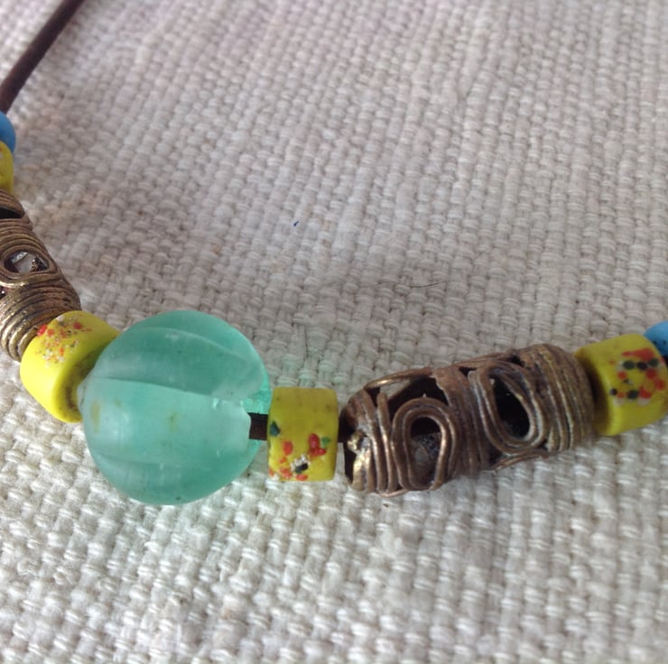 It features handmade brass beads from Africa and vintage glass beads from the Himalayas.