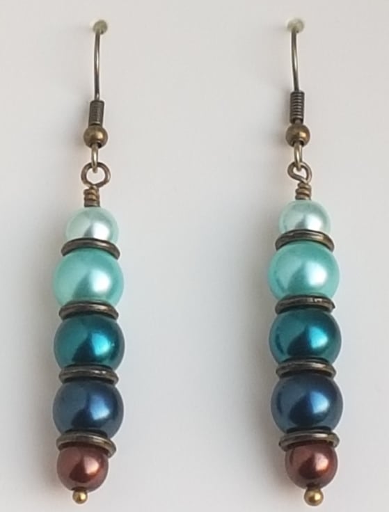 Gorgeous Aqua, Turquoise, Blue and Brown beads on dark tone ear wires. Fabulous colours together. These are simply gorgeous, the dark tone metal and the various green tone beads are a lovely combination. Great as a gift or as an everyday pair of earrings.