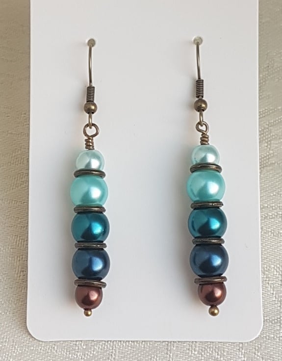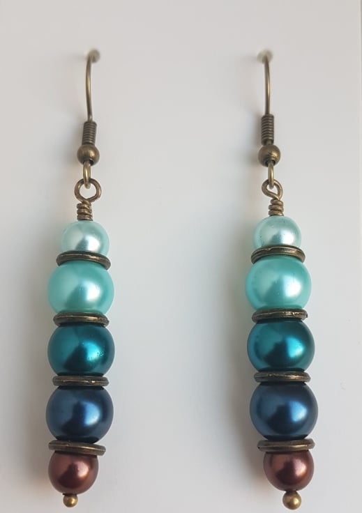 Gorgeous Aqua, Turquoise, Blue and Brown beads on dark tone ear wires. Fabulous colours together. These are simply gorgeous, the dark tone metal and the various green tone beads are a lovely combination. Great as a gift or as an everyday pair of earrings.
