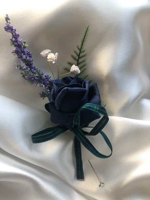 Scottish Highland theme Boutonniere / Buttonhole Keepsake. Created with a midnight blue rose and mixed artificial floral spray. Complimented with a tartan bow and matching stem in the tartan of your choice, just choose from the dropdown list. The tartan in the photos listed is Blackwatch. If you don't see the tartan you would like just message me and I will be happy to try and source.