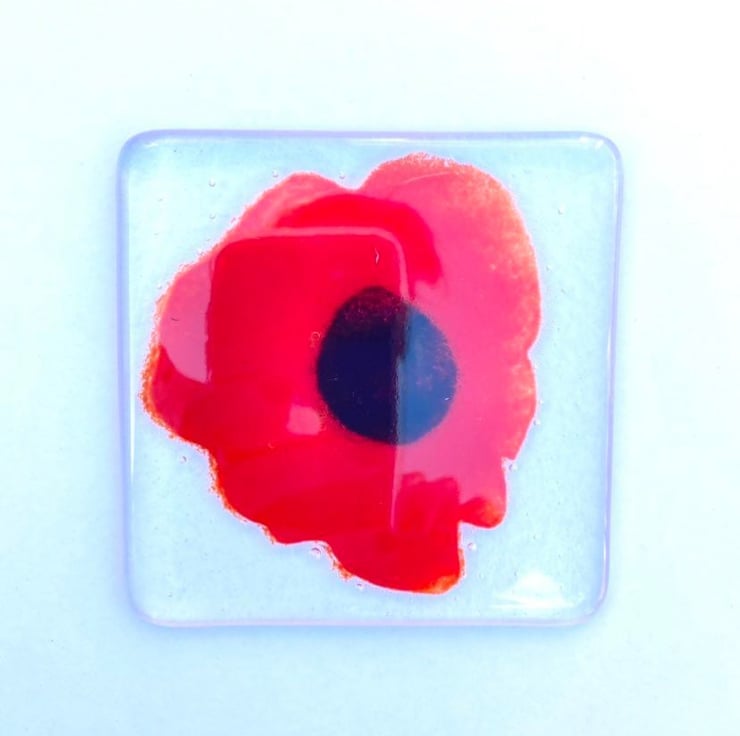 This coaster has a clear background with a red poppy flower design. The coaster comes with 4 plastic feet to sit nicely on your coffee table or side.