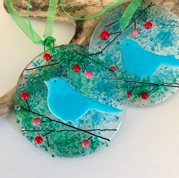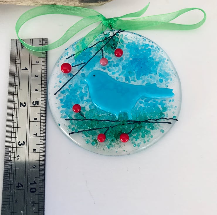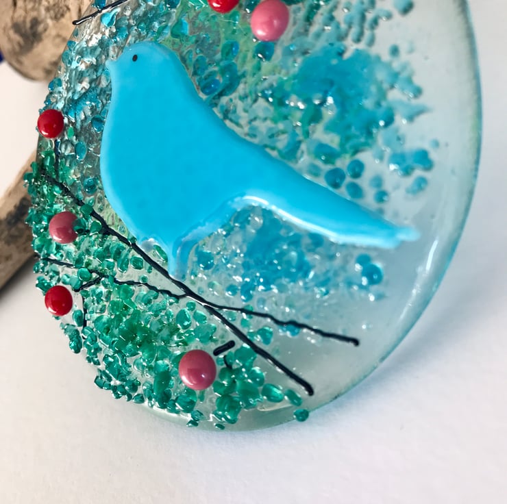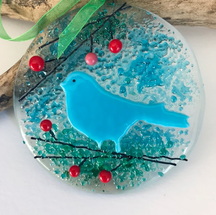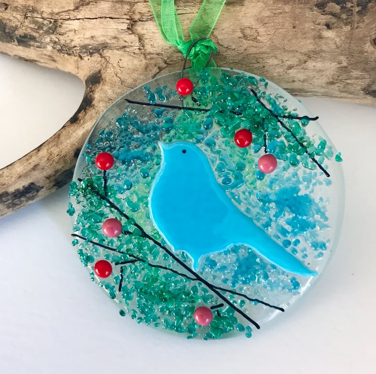 This fused glass blue bird suncatcher is handmade by me in my Yorkshire studio.