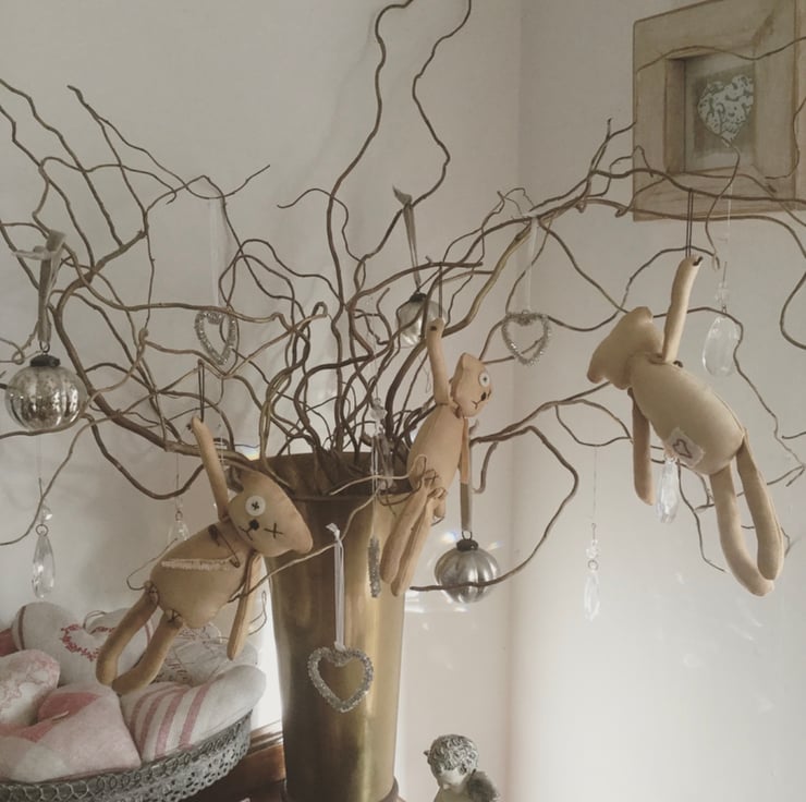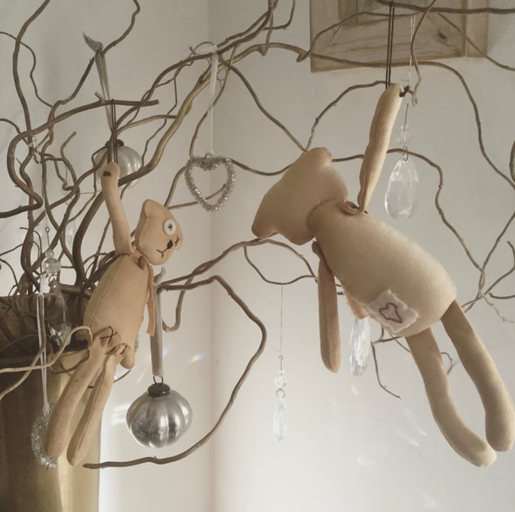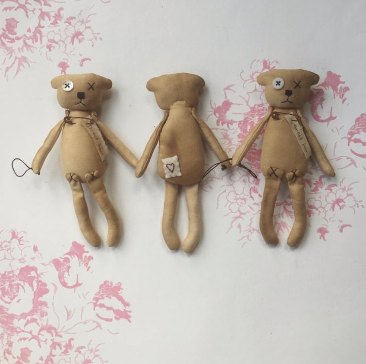 Each bear is made from tea/coffee stained cotton to give them an aged appearance. The limbs are attached with X-stitch and the facial features, with one pearl button, are also hand stitched.